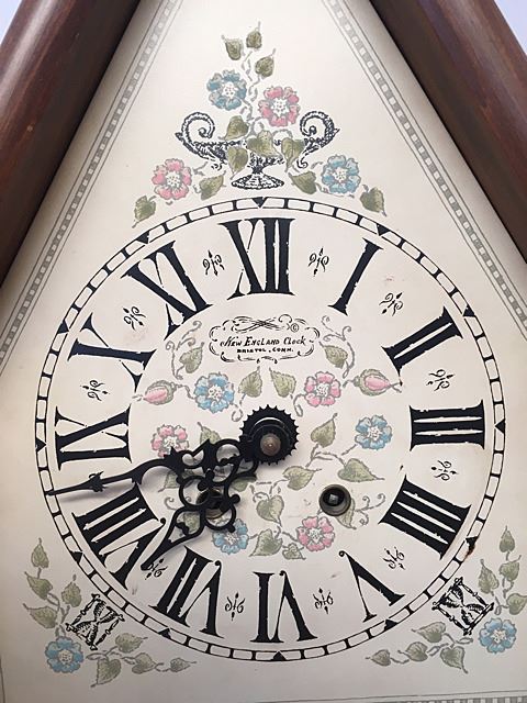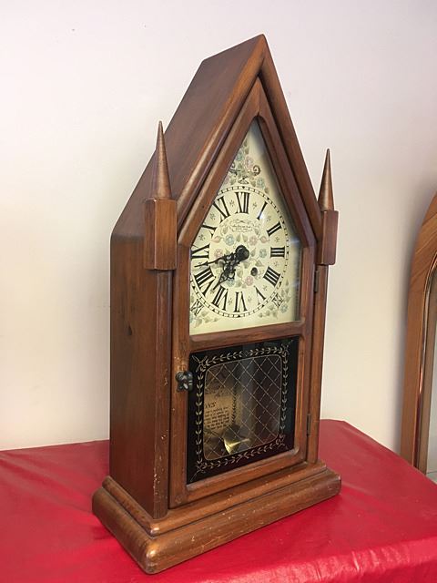 New England Clock Co., Bristol, CT, 8 day spring wound steeple clock with pendulum, nice glass, case, face and label.
