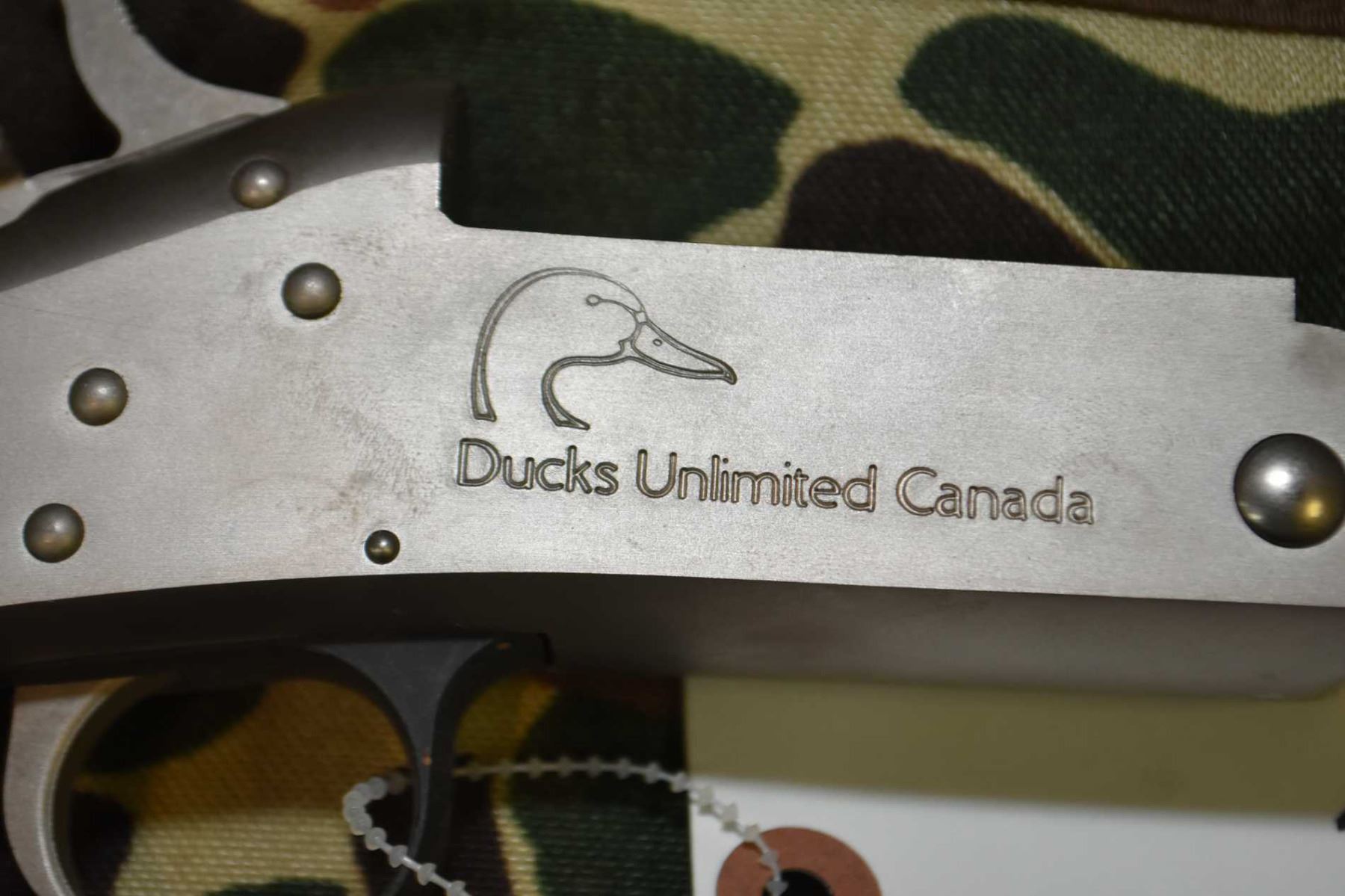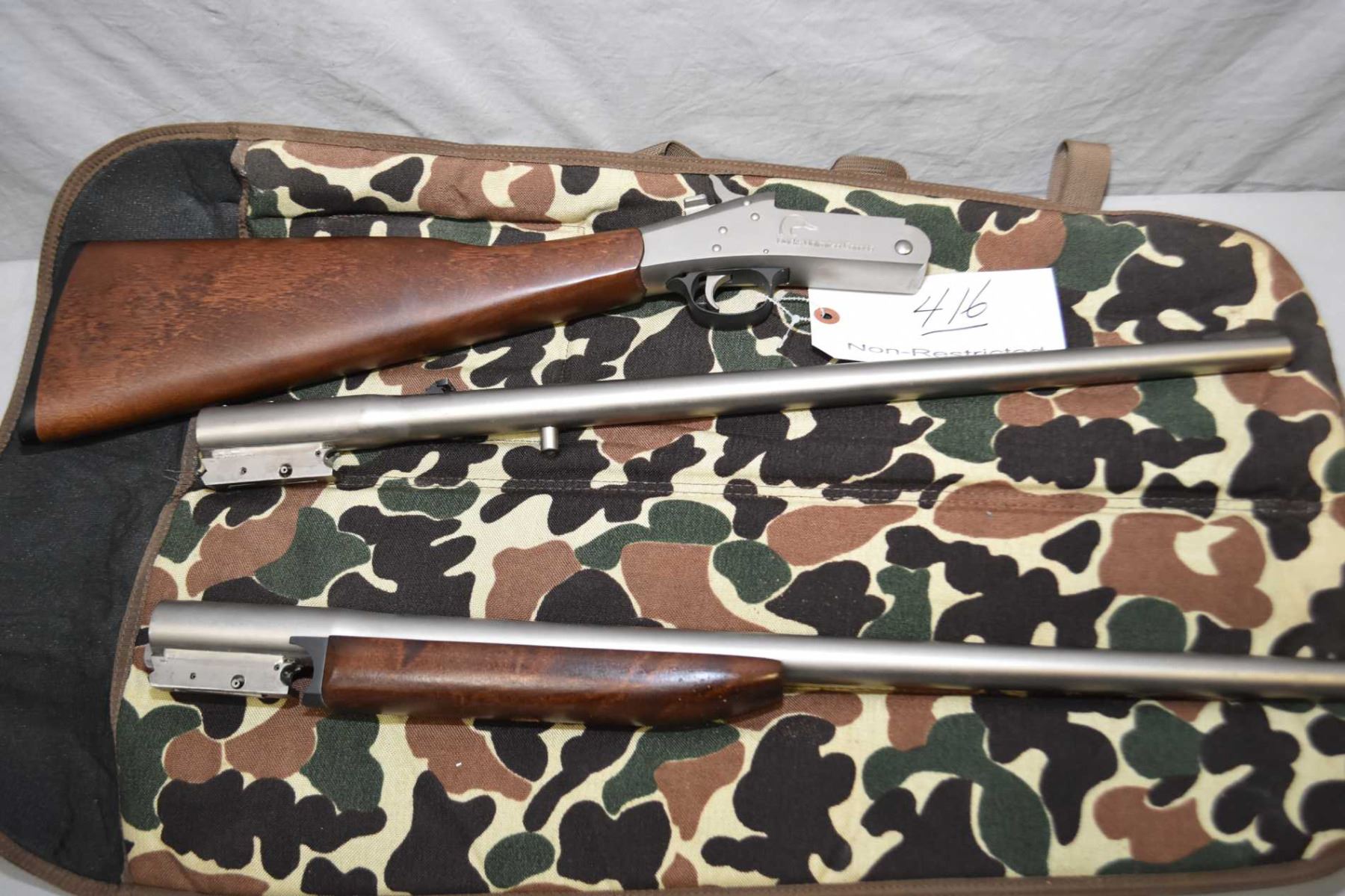 New England Firearms Co. Model Ducks Unlimited Canada Handigun S.B. 2 .30 - 30 Win Cal and .20 Ga 3" Bbl Single Shot Break Action Shotgun / Rifle w/ 22" rifle bbl and .20 Ga 3" shotgun bbl [ stainless finish, blued sights w/ some rust to front sight on rifle barrel, bead sight on shotgun bbl, some marks to metal, and forewood, only one forend, butt stock appears good, receiver stamped Ducks Unlimited Canada, possibley factory test fired, c/w soft Ducks Unlimited Canada take down camoed case ] Ser #