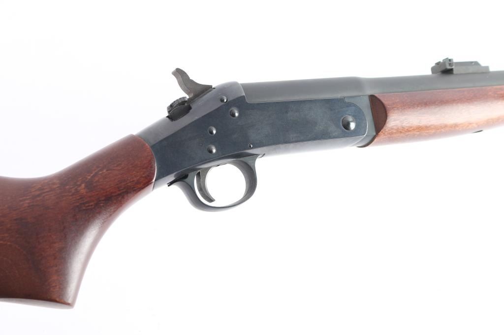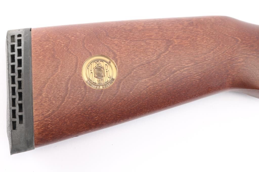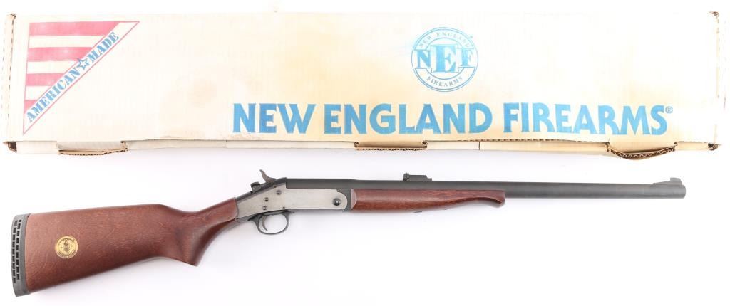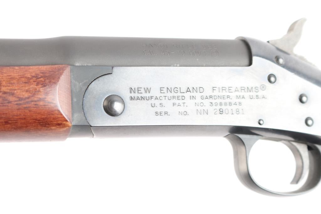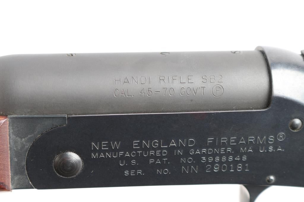 SN: NN290181. "H&R 1871 Handi-Rifle" refers to the modern line of single-shot rifles produced by New England Firearms after the original H&R went out of business. Modular break-open single-shot rifle with a .45-70 chambered barrel. Features a blued receiver, matte barrel, 22" medium-contour barrel with recessed crown with ramped blade front and micro adjustable square notch rear sights, barrel drilled/tapped for optics, smooth trigger, schnabel wood forend and semi-pistol grip shoulder stock with factory vented recoil pad, right side of stock has inletted brass disk reading "H&R 1871 Limited Edition". Rifle retains approximately 95% of its finish showing scattered handling marks/scratches. Barrel locks-up tight, the bore is excellent/bright, wood stocks are very good/sound with some handling loss to the finish. Comes with factory box with matching label, manual. Box has some water staining.