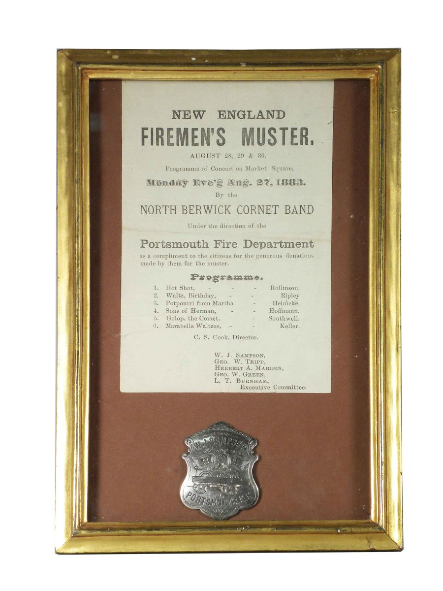 New England Firemen's Muster Invitation w/corresponding badge. Portsmouth, NH. August 28,29 & 30, 1883. W.J. Sampson on badge and invitation.