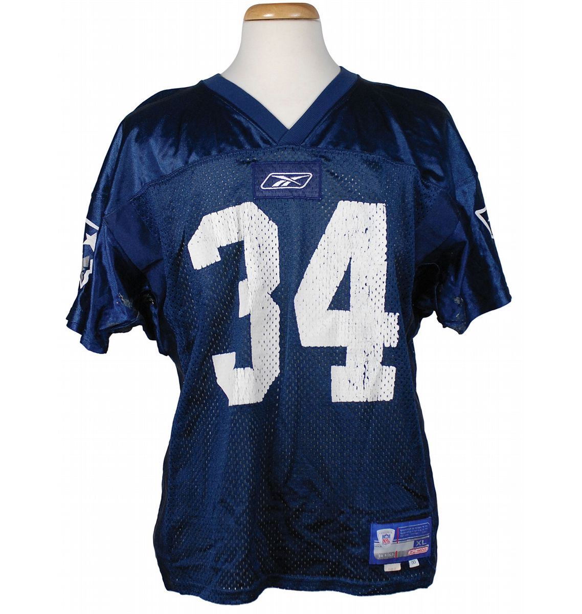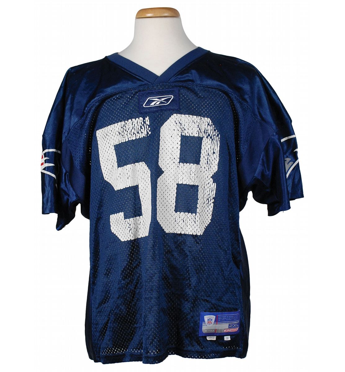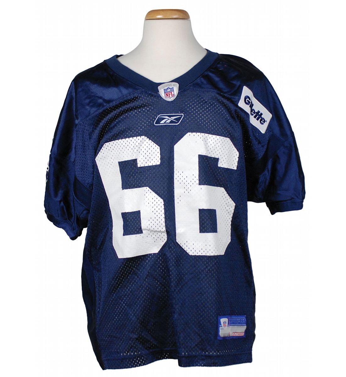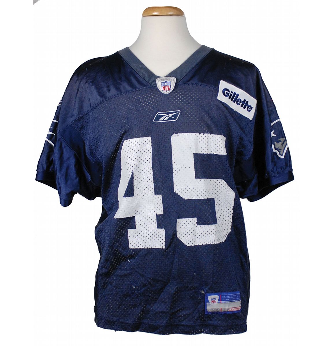 Terrific collection of ten practice-worn New England Patriots official Reebok practice jerseys from the dynastic Patriots squads of the early 2000s. Jerseys and years are: J. R. Redmond (2002), Tebucky Jones (2000), Benjamin Watson (2005), Lonnie Paxton (2002), David Patten (circa 2001), Matt Chatham (2000), Otis Smith (2002), Patrick Pass (2002), Stephen Neal (2002), and Jarvis Green (2002). Also includes a red mesh Craig James practice jersey (circa mid-1980s). All exhibit expected moderate to heavy wear from frequent use and were acquired directly from the Patriots at a 'tent sale' at Gillette Stadium in August 2013 (with the exception of the Craig James, which came from a private collection). Many retain their attached tags, reading: "This jersey is certified as Player Worn. The jersey was taken directly from locker room storage and processed by our staff. Owning an item from the ProShop Game Worn Collection is owning a piece of New England Patriots history."