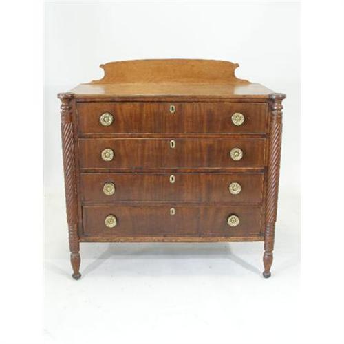 New England Sheraton Chest of Drawers, Early 19th c. - Mahogany, flame mahogany veneers, over white pine. Shaped backsplash, rectangular top with fully developed inset porringers to front corners over spiral and ring turned columns, Four cockbeaded drawers, skirt consists of an inlaid band of burled wood, original brasses. Several veneer patches. 44"h x 43"w x 22"d.