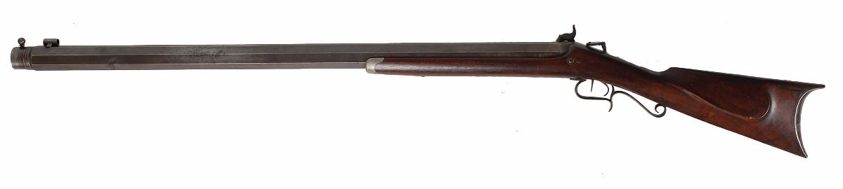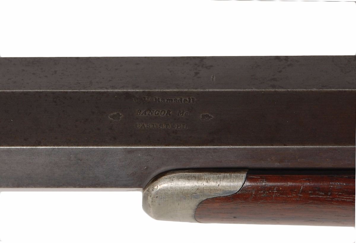 Impressive New England Target Rifle Made in Bangor, Maine, by Charles V. Ramsdell, no serial number, .48 caliber, 33.75? heavy octagon barrel with an excellent, bright bore. This is a twenty-pound behemoth of a percussion target/sharpshooter type rifle and was built by Ramsdell circa 1861. This rifle is of a type commonly made by Ramsdell and is similar to those used by the Maine Sharpshooter's Company, but does not have a provision for a ramrod. Rather, a flared metal bench rest was once fitted to the underside of the barrel about 6? back from the muzzle but has since been removed. The barrel retains most of the original browned finish with scattered mottling and freckling throughout (most noticeably on a faded area along the top flats about one foot back from the muzzle). Additional silvering and fading is present on the high edges and two filled holes are present along the top just ahead of the breech where a scope or tube sight was once installed (a period globe front sight and windage-adjustable lollipop rear sight are currently installed). The barrel is maker marked: “C.V. Ramsdell, Bangor, Me, Cast Steel,” as is the back-action lockplate which retains slightly muted original color case-hardening mixing with a dull pewter gray around the edges. The walnut stock has a swooping cheek-piece and a mellow original oil finish with scattered light handling marks and small blemishes. Additionally, there is a short with-the-grain crack running back from the pewter forend cap on the right side, a stable cross-grain crack on the top of the wrist on the right side, and a small repair on the right side of the stock belly just aft of the wrist. The stock furniture retains the original color case-hardening as does the wrist tang. The lock functions flawlessly and the double set triggers have a crisp, extremely light let-off. Charles Ramsdell was perhaps the best known and highest quality gun maker in Maine before the Civil War, working from 1850 to around 1870. For reference see pages 68–70 of Maine Made Guns and Their Makers by Dwight B. Demeritt.