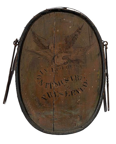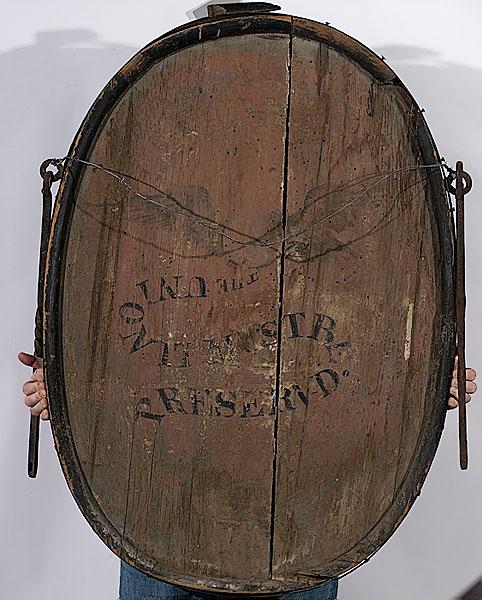 American, New England, sign is late 18th to early 19th century, painting is mid 19th century. Made of pine in an oval shape with molded edge and having original iron brace surrounding with attached bars for hanging. A two sided sign, one side depicting an Eagle clutching in his beak a banner that reads THE UNION IT MUST BE PRESERVED. Other side is the same but has two eagles and is signed W. Kenneth spt (lower right); 47" high x 34" wide.