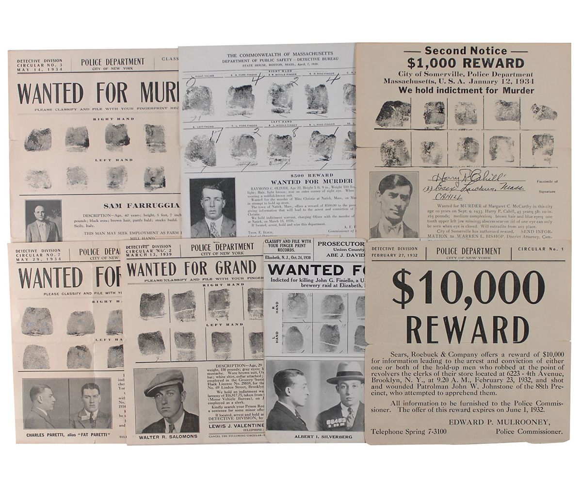 Seven wanted posters issued throughout the 1930s, ranging in size from 8 x 8 to 8.25 x 11, featuring images, descriptions, and fingerprints of the wanted suspects. Five of the men were wanted for murder, one for grand larceny, and one for a pair of men who held up a Sears and Roebuck store. Storage folds (some with slight separations), and creasing to a few, otherwise overall fine condition. Provenance: Eugene Canevari Collection.