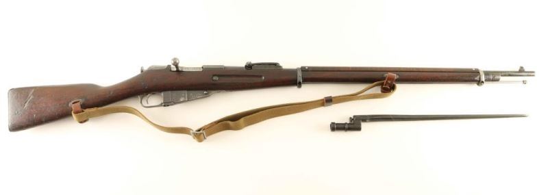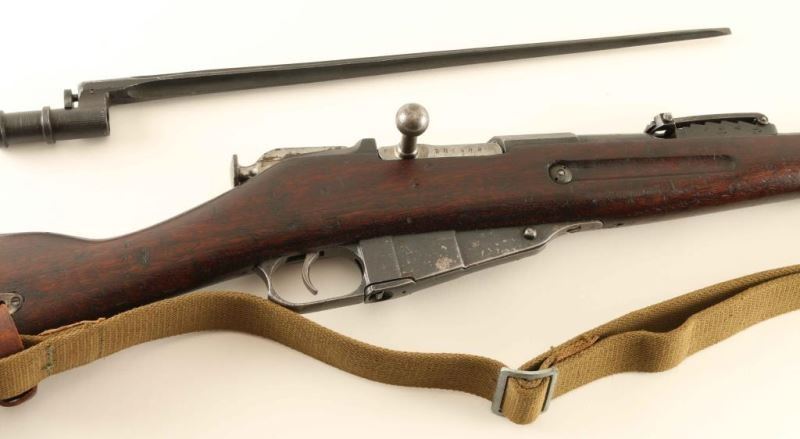 SN: 43644 Finnish military magazine-fed bolt action service rifle chambered in 7.62x54Rmm, produced in the United States circa 1915. Imported by C.A.I. of St. Albans, V.T. with import marks on the barrel. Featured a blued finish, 31.6" barrel, cruciform bayonet, dovetailed blade front sight, flip-up ladder style rear sight graduated to 3,200 meters, cleaning rod, 5 round internal box magazine, hex receiver, straight bolt handle, two barrel bands, tan canvas sling, smooth wood handguard and full-length straight grip shoulder stock with finger groove forend & smooth metal buttplate. The barrel is stamped with "SA" and "D" over the chamber. Serial numbers match on the receiver, barrel and bolt. Rifle retains approximately 30% of it's blued finish showing heavy wear, light scattered surface rust and pitting on the magazine. Action is smooth, the bore is very good and wood stocks are good. Condition is near NRA Good. ***C&R Firearm*** From The John F Sukey Collection