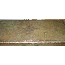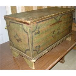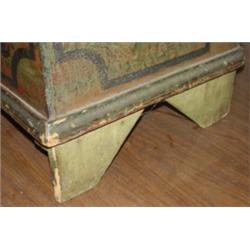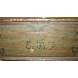 New England original painted blanket chest with bootjack feet. Initialed on the front in black paint E.B.F. Chest has floral motif on all four corners of front and one large flower on center of lid. Paint is green, red, & black. Some wear to edge of lid is visible. Hinges have possibly been replaced but has original lock. Measures 24" tall, 41 1/2" wide, and 18 1/4" deep.