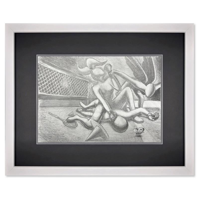 New Entry is an original drawing on paper by Mark Kostabi, hand signed by the artist. This piece comes custom framed and includes a certificate of authenticity. Measures approximately 14 x 17.5 (frame), 8 x 11.5 (image).