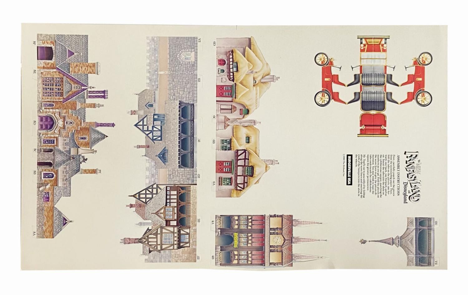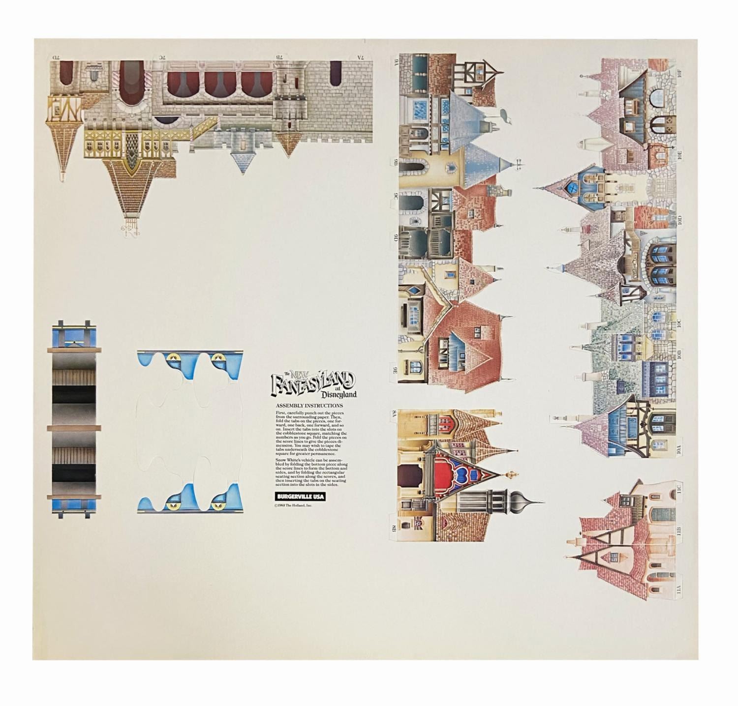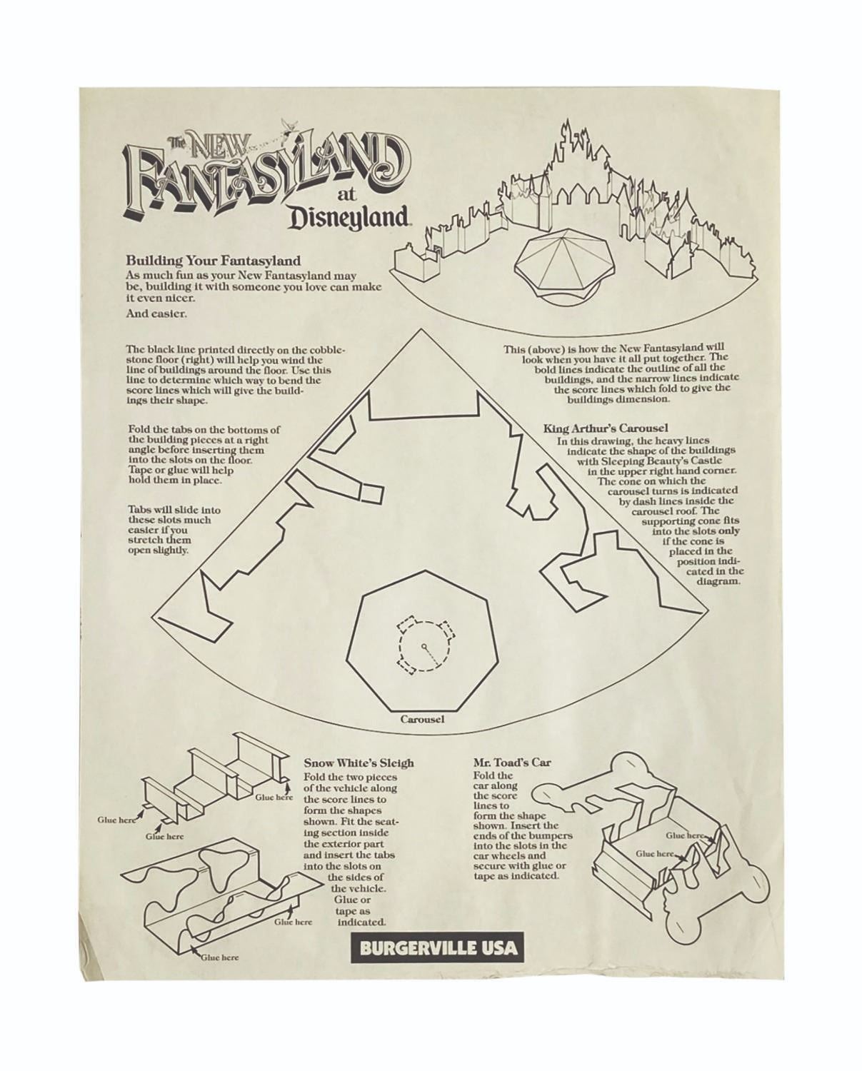 (Disneyland, 1983) A rare paper model created for the opening of New Fantasyland at Disneyland. A fast food chain local to the Pacific Northwest, Burgerville released this punch-out kit promoting Fantasyland's redesign. The set is complete and unused, and features the various buildings of Fantasyland, ride vehicles from Mr. Toad and Snow White, and the Carousel. None of the pieces have been punched out, although some have begun to separate with age, particularly the cobblestone courtyard. An instructional sheet is also included. Ranging from 23"x13.5" to 21.5"x23", the kit is in very good condition, with a few spots where the surrounding paper has torn away.