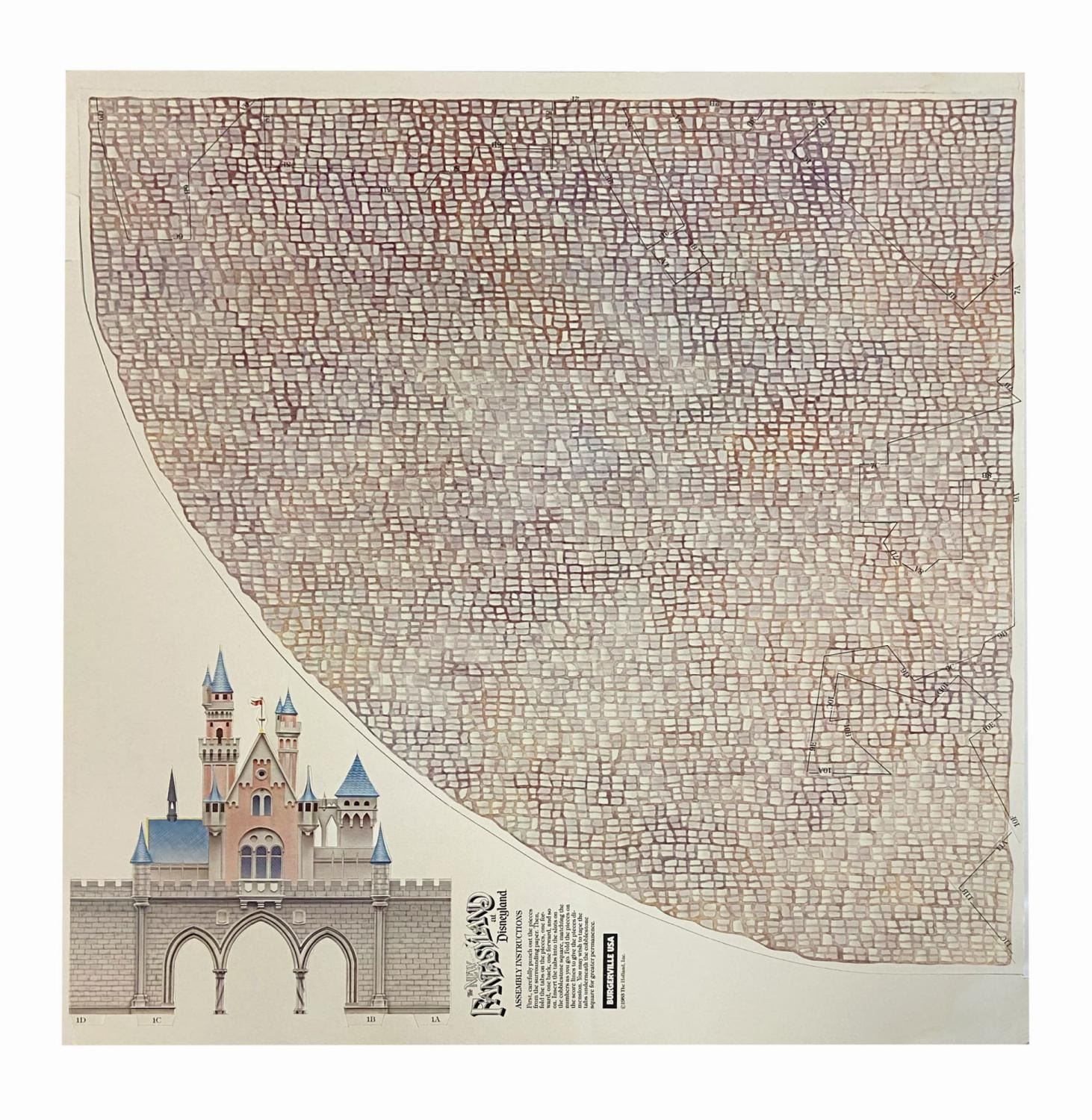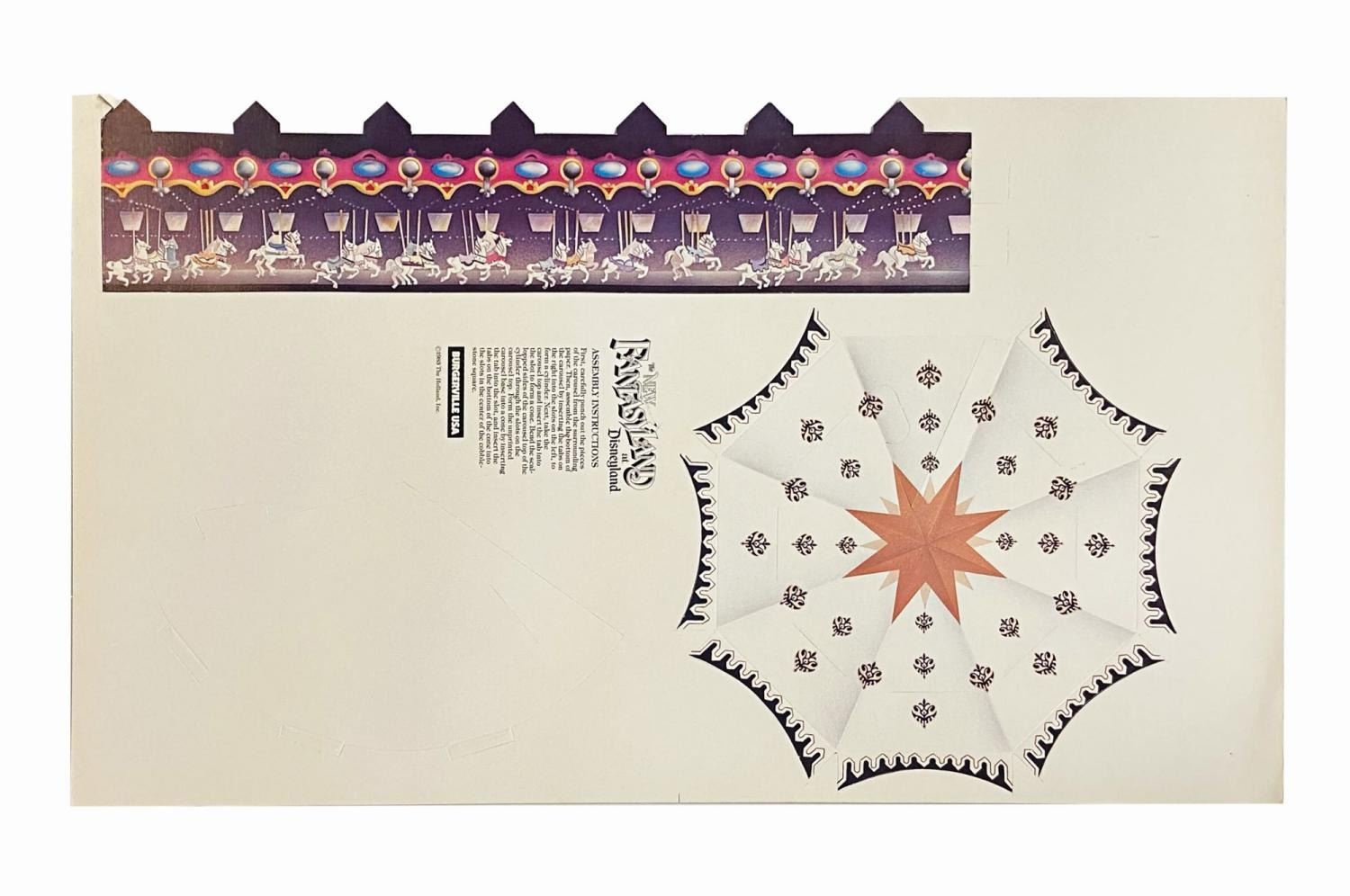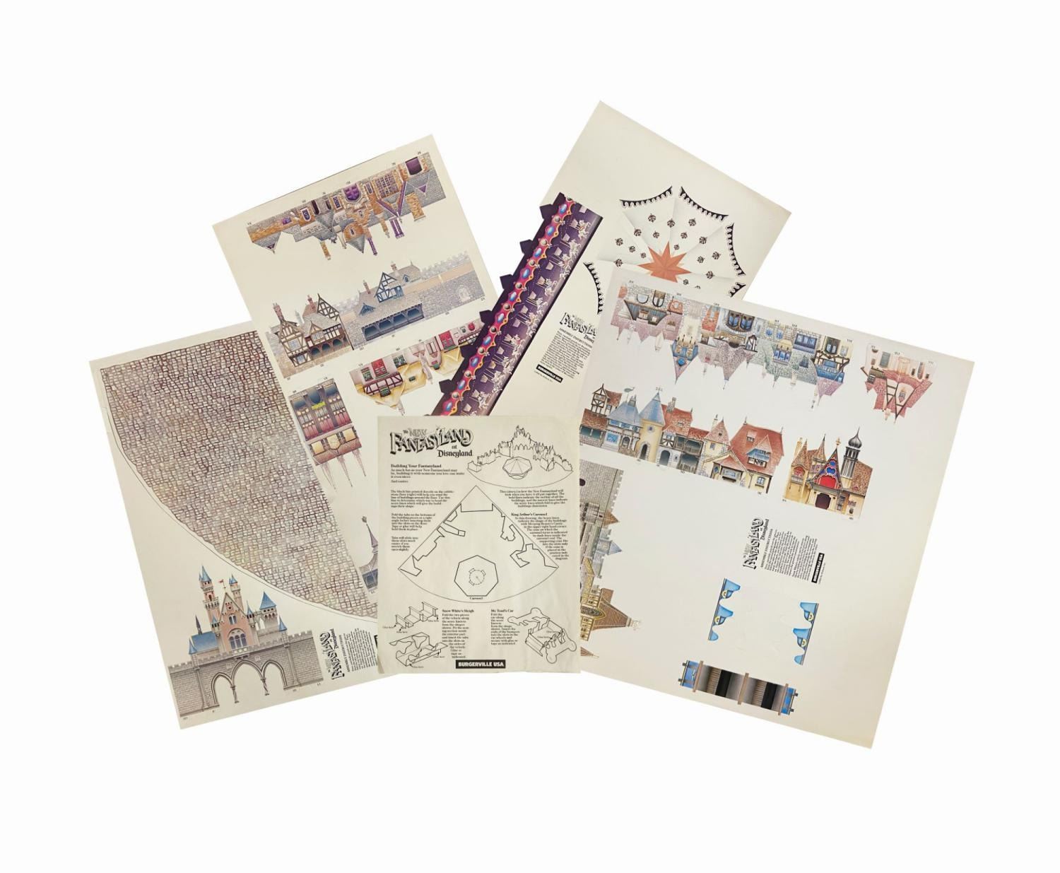 (Disneyland, 1983) A rare paper model created for the opening of New Fantasyland at Disneyland. A fast food chain local to the Pacific Northwest, Burgerville released this punch-out kit promoting Fantasyland's redesign. The set is complete and unused, and features the various buildings of Fantasyland, ride vehicles from Mr. Toad and Snow White, and the Carousel. None of the pieces have been punched out, although some have begun to separate with age, particularly the cobblestone courtyard. An instructional sheet is also included. Ranging from 23"x13.5" to 21.5"x23", the kit is in very good condition, with a few spots where the surrounding paper has torn away.