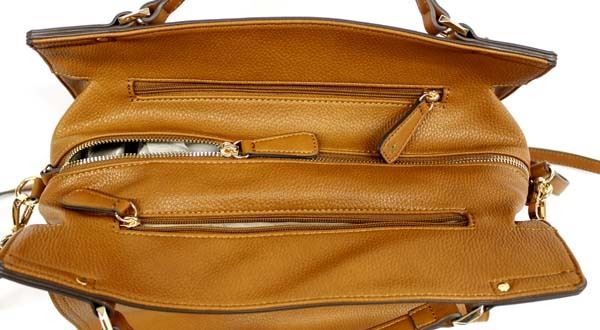 Large Poly Synthetic (Man Made) Leather Satchel Square Purse measuring 13'' x 10.5'' x 4.5'', removeable straps, 3 inside zippered pockets and 2 slip pockets