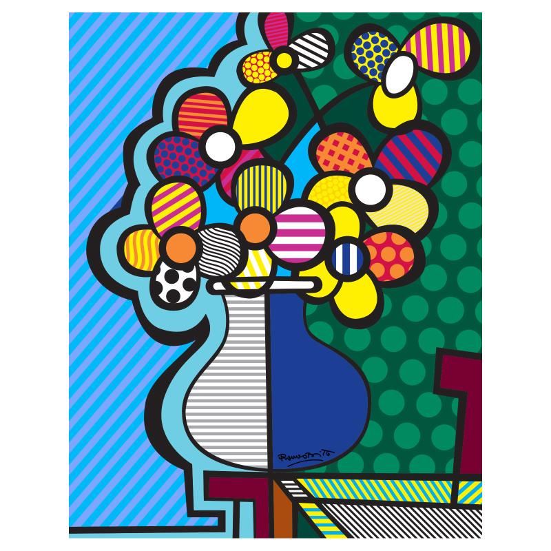 "New Flower" is an open edition giclee on canvas by Romero Britto. The piece comes hand signed by the artist and is authenticated en verso with the official Britto stamp. Measures approximately: 14" x 11".