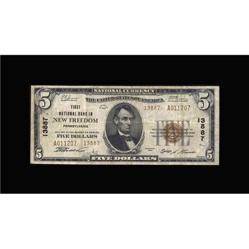 <B>New Freedom, PA</B></I> - $5 1929 Ty. 2 <B>First NB</B></I> Ch. # 13887<BR>This Type 2 only institution was chartered in December of 1933, and only issued $5's, with this example the new highest serial number of the six notes recorded. <B>Fine.</B></I>