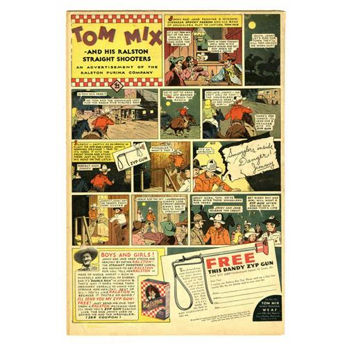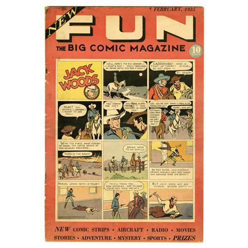 <B>New Fun Comics #1 (DC, 1935) Condition: Apparent VG.</B></I> This is the first DC comic book, and it's a milestone by any standard. It's "the prototype of the modern comic in that it featured an anthology format of continuing characters and original rather than reprinted material," as Overstreet once put it. This oversized comic measures 10 1/2 by 15 inches (being the first tabloid-sized comic is another distinction that it holds). This first issue is actually simply called <B>New Fun: The Big Comic Magazine</B></I>, and it started a series which became <B>More Fun Comics</B></I>. It was the brainchild of a former pulp writer named Major Malcolm Wheeler-Nicholson, who saw the success of Eastern Color's <B>Famous Funnies</B></I>, which was an all-reprint affair, and reasoned that all-new material in a larger format could top the competition. There's the first comic book appearance of Oswald the Rabbit (later seen in Dell's <B>Four Color</B></I> series) and the debut of Barry O'Neill (who was later a regular in <B>Adventure Comics</B></I>). Some of the other features have a marked similarity to established characters of the day, such as the Flash Gordon-esque "Don Drake on the Planet Saro" and a Jack Armstrong ripoff called "Jack Andrews, All-American Boy." This all black-and-white issue has more than just comics -- there are text features covering sports, airplanes, model-building, and radio and movies, and there are photos of cowboy stars Johnny Mack Brown and Tim McCoy, plus a group photo of the Buck Rogers radio actors. Incidentally, this is also one of the first modern comic books to have ads, and wouldn't you know it, one of them is a Charles Atlas ad! This issue is currently #23 in Overstreet's ranking of the most valuable comics, which is even more impressive considering that Overstreet doesn't list a NM- or even a VF/NM value for the issue. Since this issue's got lots of coupons and a number of cut-out features meant for kids to use their scissors on, there can't be many other complete copies in existence of this rarity, a Gerber "8". This copy has a spine split unobtrusively sealed with tape on the interior along the entire length of the spine. The centerfold is detached, and there is some slight rust migration at the top staple. Overstreet 2005 GD 2.0 value = $6,650; VG 4.0 value = $13,300.