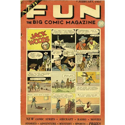 <B>New Fun Comics #1 (DC, 1935) Condition: Apparent VG.</B></I> This is the first DC comic book, and it's a milestone by any standard. It's "the prototype of the modern comic in that it featured an anthology format of continuing characters and original rather than reprinted material," as Overstreet once put it. This oversized comic measures 10 1/2 by 15 inches (being the first tabloid-sized comic is another distinction that it holds). This first issue is actually simply called <B>New Fun: The Big Comic Magazine</B></I>, and it started a series which became <B>More Fun Comics</B></I>. It was the brainchild of a former pulp writer named Major Malcolm Wheeler-Nicholson, who saw the success of Eastern Color's <B>Famous Funnies</B></I>, which was an all-reprint affair, and reasoned that all-new material in a larger format could top the competition. There's the first comic book appearance of Oswald the Rabbit (later seen in Dell's <B>Four Color</B></I> series) and the debut of Barry O'Neill (who was later a regular in <B>Adventure Comics</B></I>). Some of the other features have a marked similarity to established characters of the day, such as the Flash Gordon-esque "Don Drake on the Planet Saro" and a Jack Armstrong ripoff called "Jack Andrews, All-American Boy." This all black-and-white issue has more than just comics - there are text features covering sports, airplanes, model-building, and radio and movies, and there are photos of cowboy stars Johnny Mack Brown and Tim McCoy, plus a group photo of the Buck Rogers radio actors. Incidentally, this is also one of the first modern comic books to have ads, and wouldn't you know it, one of them is a Charles Atlas ad! This issue is currently #25 in Overstreet's ranking of the most valuable comics, which is even more impressive considering that Overstreet doesn't list a NM- or even a VF/NM value for the issue. Since this issue's got lots of coupons and a number of cut-o <BR><BR><B>Important notice:</B> Heritage usually auctions material at the rate of 200-250 lots per hour. On some occasions eBay Live bid software or the Internet may not be able to keep up with the pace of the auction. We recommend placing a realistic absentee bid now as insurance to avoid disappointment. Occasionally the auctioneer may eliminate or reject an eBay Live bid, and the auctioneer may also reopen a lot after the close of the eBay live bidding (usually because we missed an audience bid), and may reject your bid even if it shows you as the winning bidder. By bidding via eBay Live, you agree that Heritage may award the lot to another bidder at its sole discretion under the circumstances described above or any other reasonable circumstances. Since eBay bids are not shown to us until we open the lot on the floor, we treat those bids just like floor bids. In most cases the floor responds before the eBay bid is presented to us, due to Internet lag time, so for consistency we have made it a policy that floor bids are always considered first over tie eBay live bids. Also please note that all Heritage lots purchased through eBay Live carry a 22.5% Buyer's Premium. Please make sure you read the Terms and Conditions before you bid. This lot is being auctioned in conjunction with a live floor auction by Heritage Auction Galleries. All final auction and invoice information will be supplied by Heritage Auction Galleries, and all other information should be considered preliminary. Lot:41001 <BR><BR><B>Winning Notification and Billing:</B> After the FINAL session in this auction is complete, Heritage will send e-mail and snail mail invoices. This process normally takes several days. All final auction and invoice information will be supplied by Heritage Auction Galleries, and all other information should be considered preliminary. <BR><BR>This auction will be conducted on a live auction floor and over the Internet through eBay Live. If you choose to place an absentee bid, please take a moment to <font color='#0000ff'><u><a href='http://pages.ebay.com/liveauctions/help/before/laabsentee.html'>learn how eBay Live absentee bidding works</a></u></font><font color='#000000'>