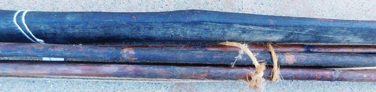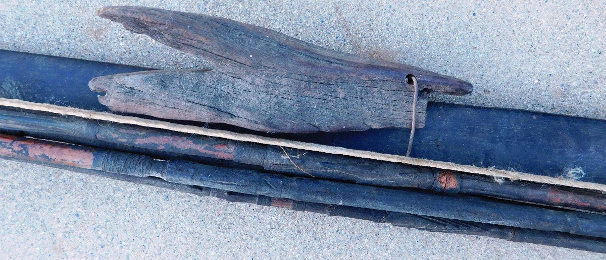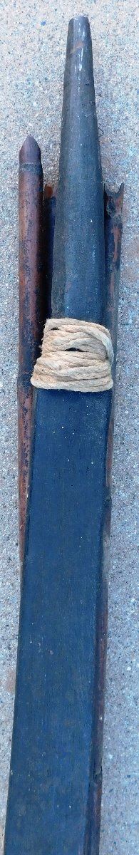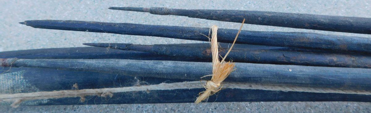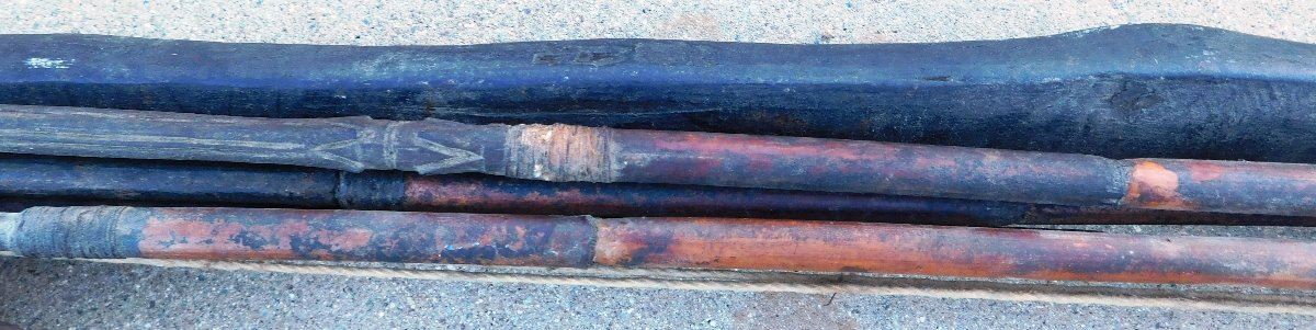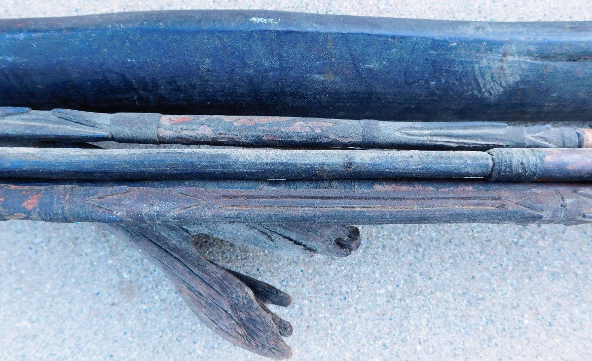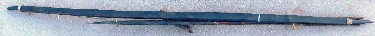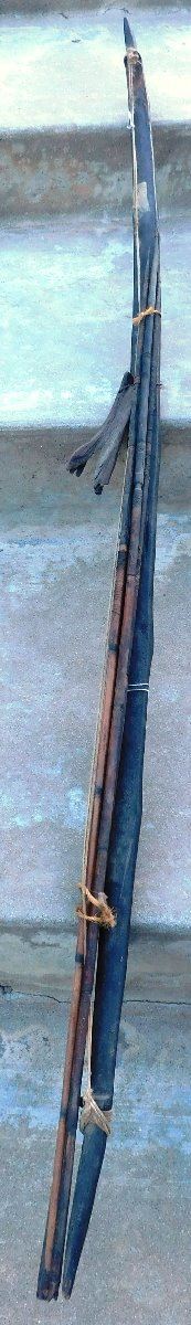 New Guinea Bow & Arrows, circa WWII. Made of hardwood and bamboo, the bow measures 65" x 1.5" and the 4 arrows are 45" to 48" long. Papua New Guinea. Has wood fetish tied to bow. Condition: Some damage and wear, see images. Shipping: $75.00 USA estimate only, due to length, w/insurance and signature. Auction house will not ship foreign; international buyers will be responsible for the export of this item.