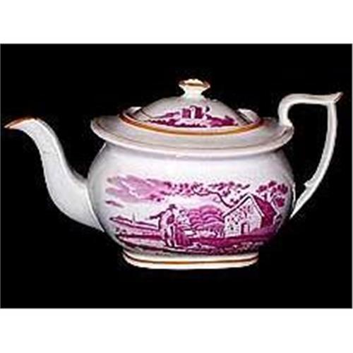 Rare pink and white New Hall Teapot with mustard trim. It is marked with the New Hall circle in sepia colored print, and on the front underneath the cottage, it says, "Winston Cottage". The dealer from whom I bought this teapot, has had it examined by several experts and he says there are only 11 of these known. At the very least this is a rare piece. There is restored damage. On one side there are cracks which show from the inside, but not from the outside. Lovely piece which would grace any collection. New Hall closed in 1835.