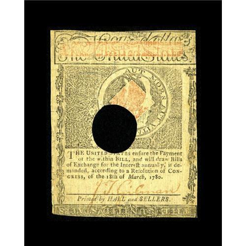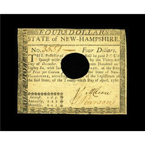 <B>New Hampshire April 29, 1780 $4 About New.</B></I> A lightly circulated example of this typical hole cancelled note with good eye appeal but with a couple of petty edge splits.<BR><BR><b>Shipping:</b> Coin/Currency (<a target="_blank" href="http://www.heritageauctions.com/common/shipping.php">view shipping information</a>)
