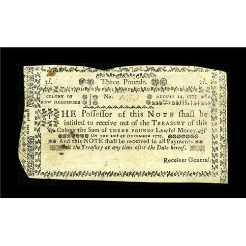 New Hampshire August 24, 1775 $3 Very Fine. Very few p