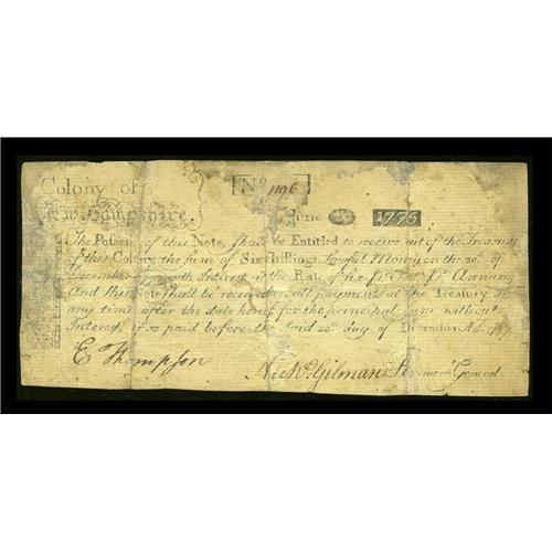 <B>New Hampshire June 20, 1775 6s Fine Repaired.</B></I> A Paul Revere printed "Copperplate Note." It has been repaired along three vertical folds and some additional restoration work has been done at the left end. Both signatures remain strong, and this both historic and rare note has retained a reasonably attractive appearance. It's one of less than a half dozen examples of this issue that we have handled over the years. Unpriced above Very Good in Friedberg or Fine in Newman.