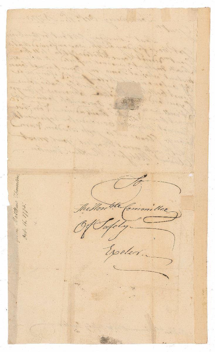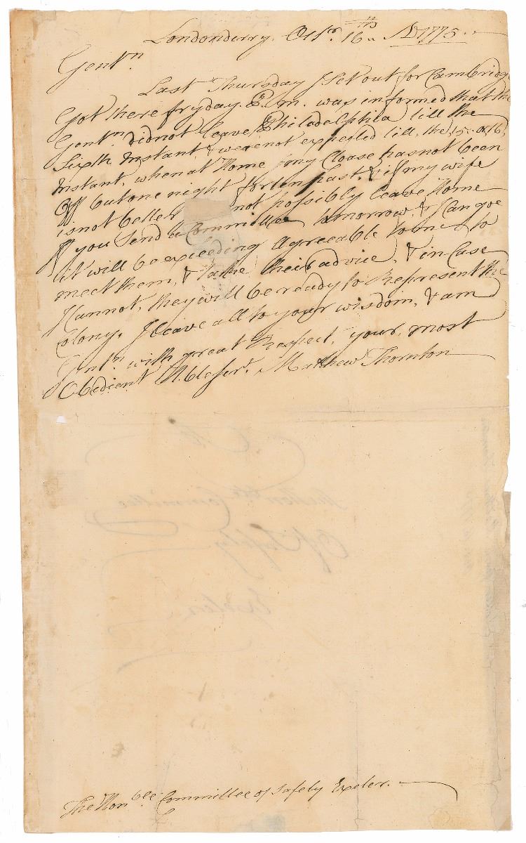 Signer of the Declaration of Independence from New Hampshire (1714–1803) who was one of eight signers born in Great Britain. Revolutionary War-dated ALS signed as president of the New Hampshire Committee of Safety, one page, 6.75 x 11.5, October 16, 1775. Written from Londonderry, New Hampshire, Thornton pens a letter to the “Hon’ble Committee of Safety,” in full [spelling and grammar retained]: "Last Thursday I set out for Cambridge I got there fryday P. M. was informed that the Gent’n. did not leave Philadelphia till the Sixth Instant & were not expected till the 15 or 16 Instant, when at Home my Cloase has not been off but one night for ten past & if my wife is not better [word missing] not possibly leave Home. If you Send a Committee tomorrow & Can goe it will be exceeding agreeable to me to meet them & take their advice, & in Case I Cannot, they will be ready to Represent the Colony. I leave all to your wisdom." Addressed on the reverse in Thornton’s own hand. In very good condition, with intersecting folds (vertical fold passing through the signature), scattered soiling, old reinforcements on the reverse to vertical edges, and two small areas of paper loss (one resulting in the loss of one word, and repaired from behind).