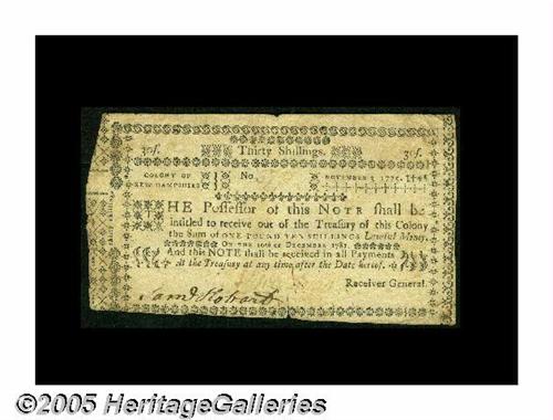 <B>New Hampshire November 3, 1775 30s Fine-Very Fine.</B></I> This Thirty Shillings is listed in Newman as a counterfeit, but this issue has always traded hands at the same price for both genuine and counterfeit examples. There is some difference of opinion among experts as to whether these were actual counterfeits or an unauthorized contemporary reissue. The signatures have always appeared to this cataloger to be quite genuine, and identical to those found on issues for which no counterfeits exist. A paper clip indentation is noticed, along with an approximate quarter-inch split at the top and an approximate half-inch split at the bottom of the vertical center fold. Still, a rare and desirable Americana heirloom that is a little older than the Declaration of Independence.