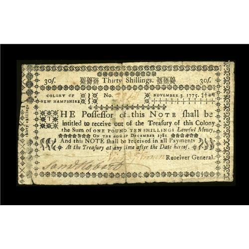 New Hampshire November 3, 1775 30s Very Fine. A partial New Hampshire November 3, 1775 30s Very Fine