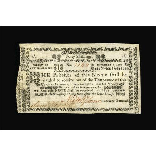 <B>New Hampshire November 3, 1775 40s Extremely Fine.</B></I> Listed as a Contemporary Counterfeit in Newman, but properly signed and printed in the shop of the man who printed the genuine notes. These notes have always been collected as avidly as the genuinely-issued pieces, and this one is an extremely nice example. It has a centerfold, which has been partially split and neatly repaired. Another soft fold is also visible. <BR><BR><b>Shipping:</b> Coins & Currency (<a target="_blank" href="http://www.heritageauctions.com/common/shipping.php">view shipping information</a>)