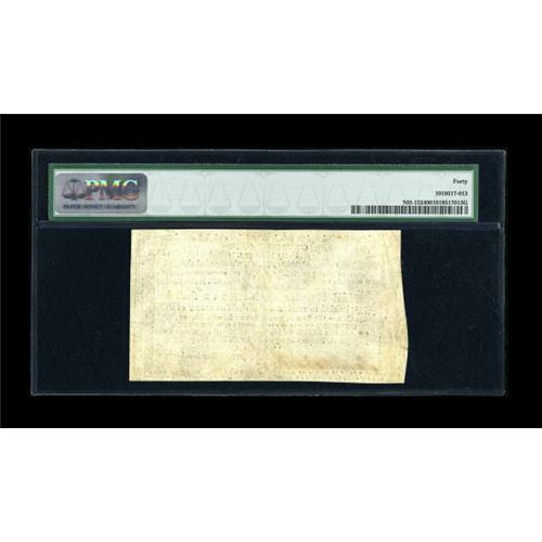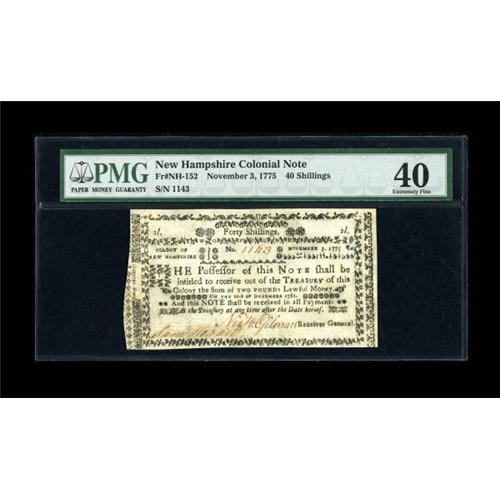 <B>New Hampshire November 3, 1775 40s PMG Extremely Fine 40.</B></I> An attractive example with all the eye appeal one would want from a lightly circulated note. Forty Shillings notes of this issue are listed as contemporary counterfeits by Newman, but these notes were properly printed and signed in the shop of the man who printed the genuine notes. These notes have always been collected as avidly as the genuinely issued pieces, and this is a nice example which is beautifully margined and clean. <BR><BR><b>Shipping:</b> Coins & Currency (<a target="_blank" href="http://www.heritageauctions.com/common/shipping.php">view shipping information</a>)