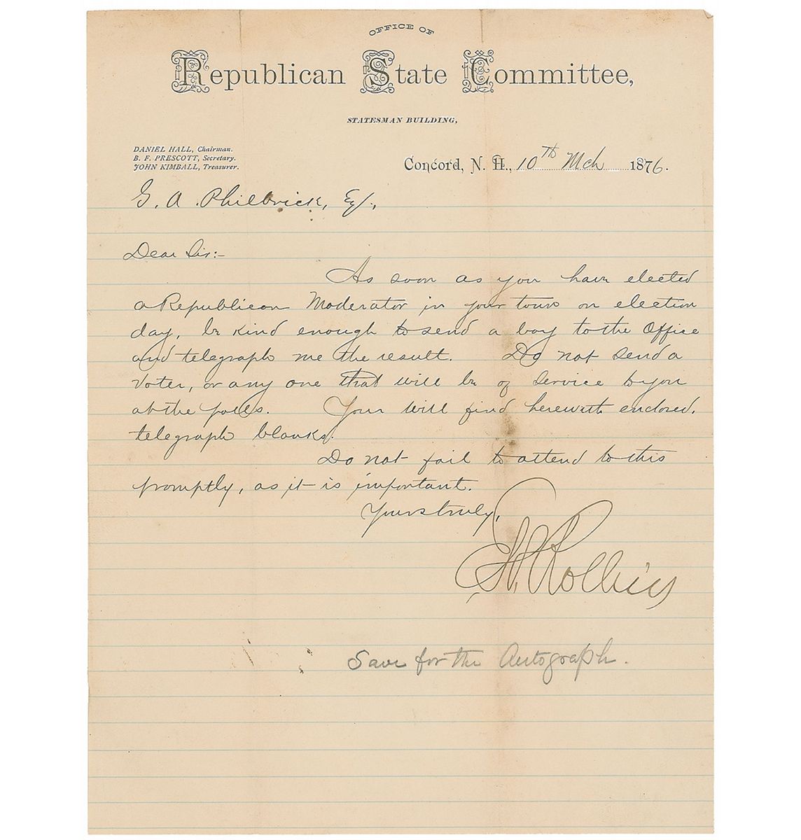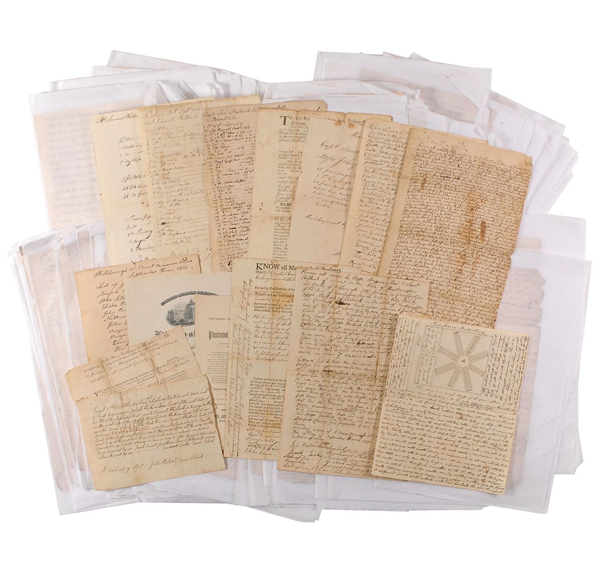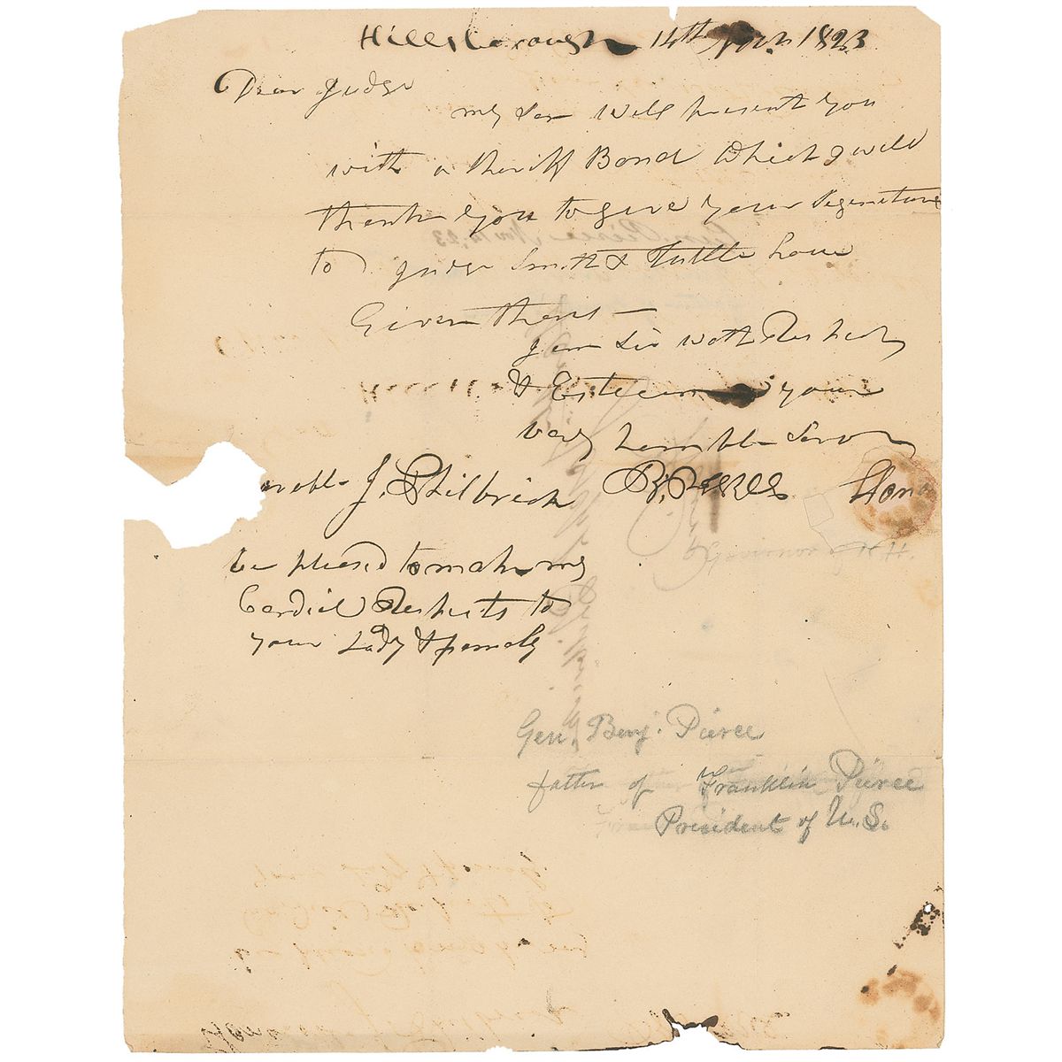 Huge archive of over 250 documents related to the Philbrick family of Seabrook, New Hampshire, dated during the 18th and 19th century. Includes 125 documents recording the sale of land, many letters, as well as bills, receipts, promissory notes, rent bills, railroad tickets, and a few poems and maps. Highlights include an LS to John Philbrick signed by General Benjamin Pierce (father of President Franklin Pierce), one page, 7.5 x 9.5, November 14, 1823, regarding a sheriff bond; an LS signed by E. H Rollins, one page, 8 x 10.5, March 10, 1876, on the topic of telegraphing returns for the 1876 election; and an ALS by Samuel Philbrick to his brother, three pages, 7.75 x 9.75, circa 1838, about his frustrations with Congress, in part: “They have been now 7 months in session & have absolutely done nothing but fight & quarrel with each other & oppress the poor Indians and blacks.” Also includes two autograph books signed by local friends, notably John Greenleaf Whittier, Wendell Phillips, and Ambrose E. Burnside. In overall very good to fine condition. A more comprehensive list is available online at rrauction.com. A unique treasure trove of material documenting New Hampshire’s transition from colony to state.