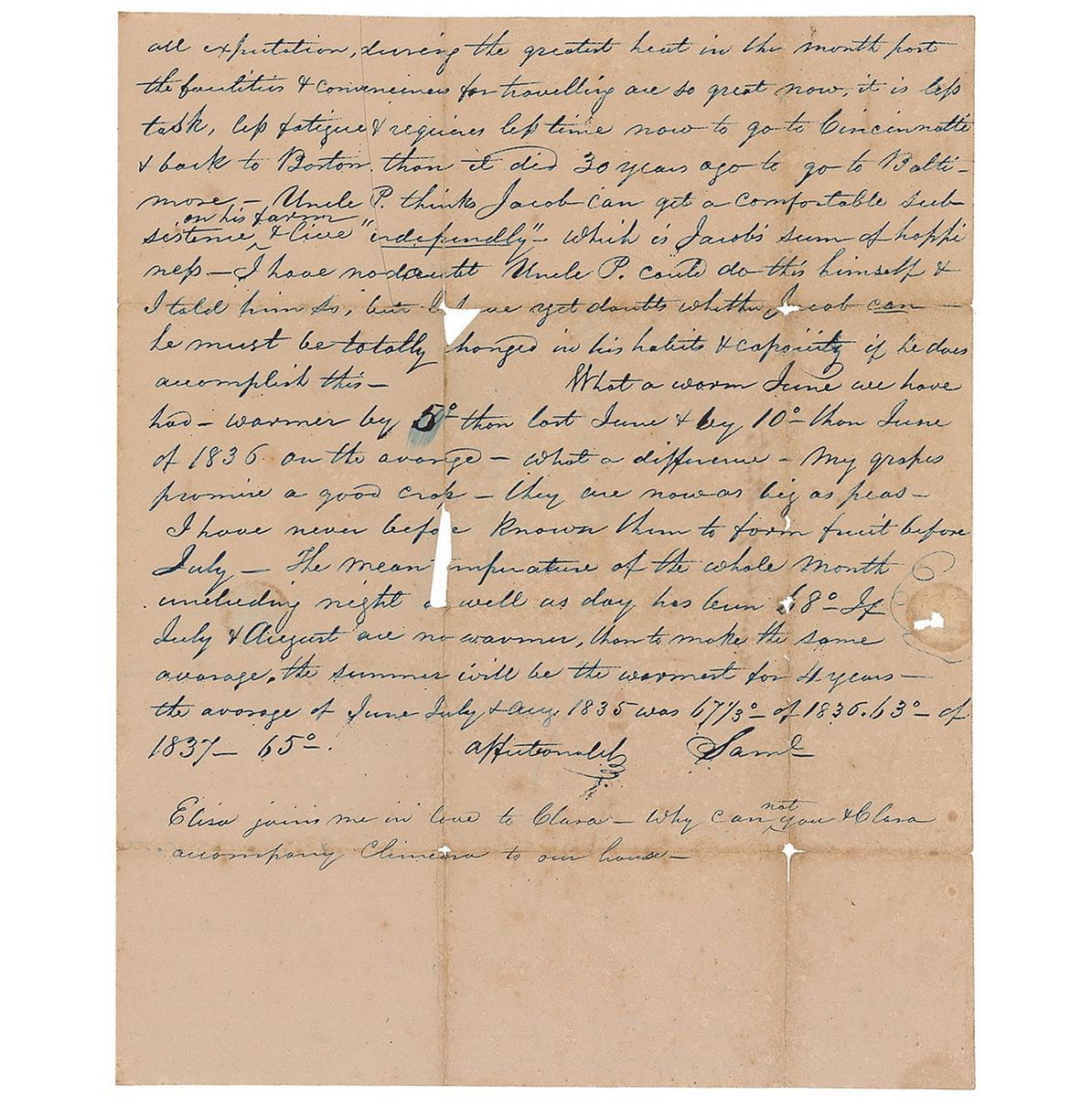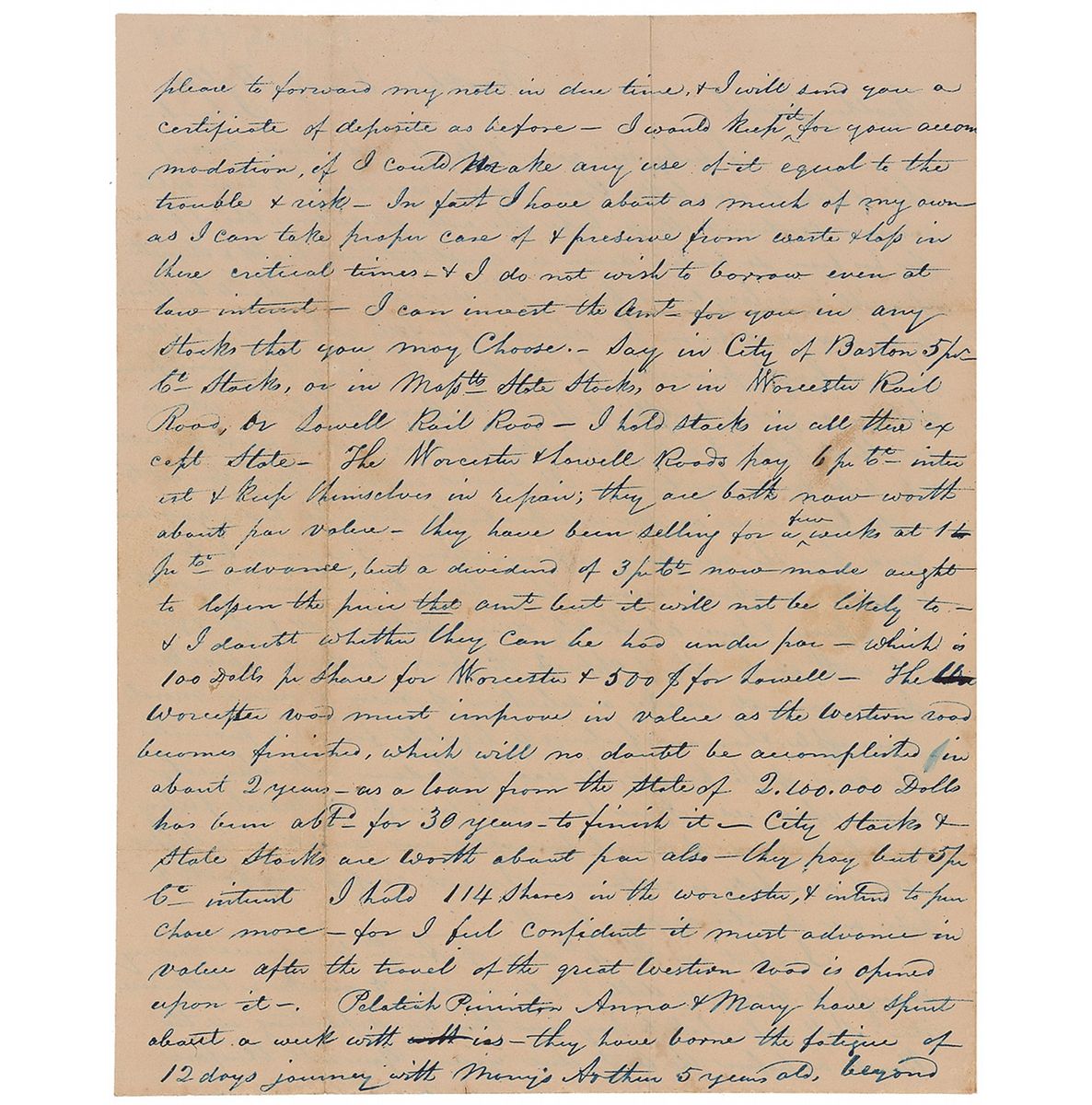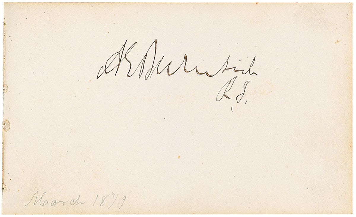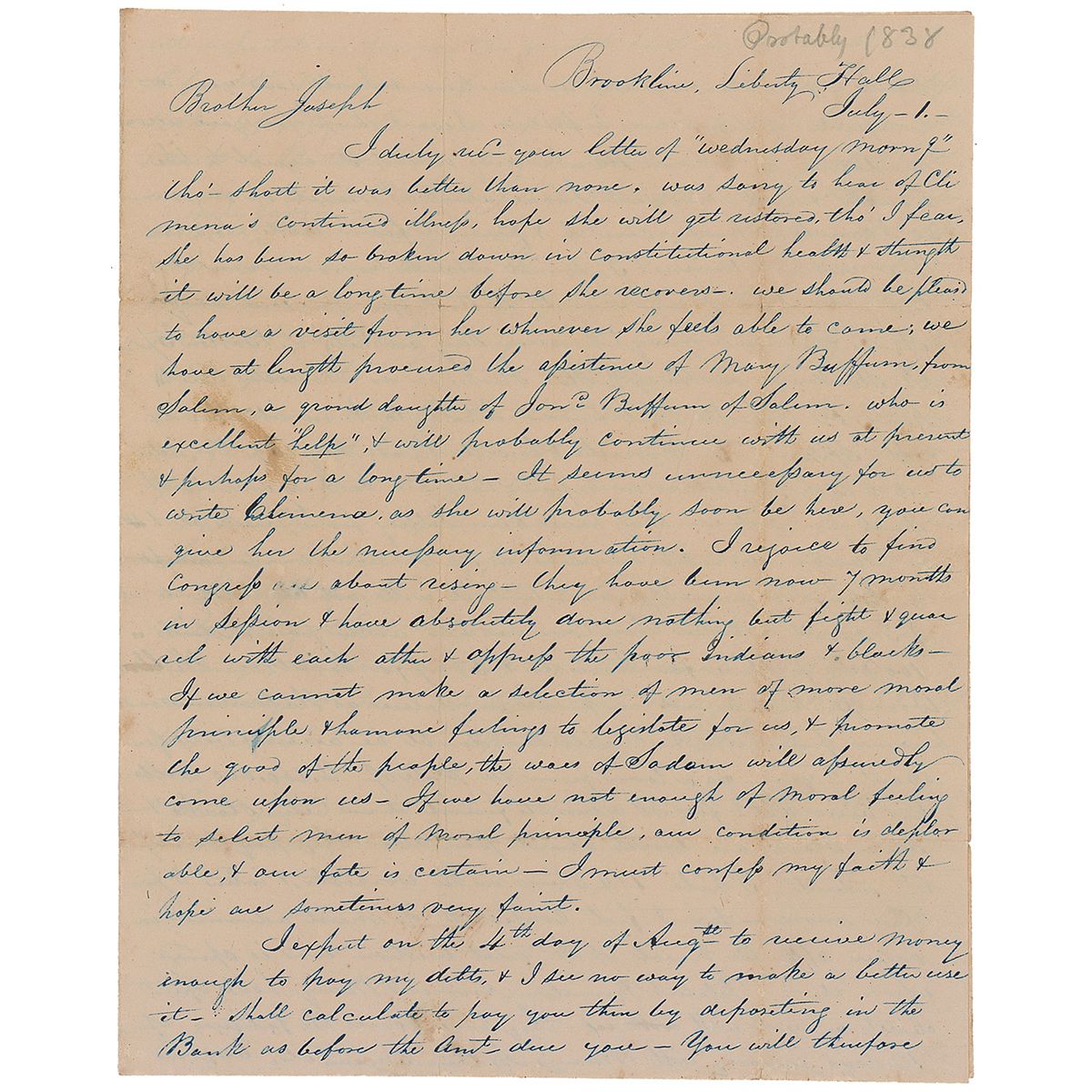 Huge archive of over 250 documents related to the Philbrick family of Seabrook, New Hampshire, dated during the 18th and 19th century. Includes 125 documents recording the sale of land, many letters, as well as bills, receipts, promissory notes, rent bills, railroad tickets, and a few poems and maps. Highlights include an LS to John Philbrick signed by General Benjamin Pierce (father of President Franklin Pierce), one page, 7.5 x 9.5, November 14, 1823, regarding a sheriff bond; an LS signed by E. H Rollins, one page, 8 x 10.5, March 10, 1876, on the topic of telegraphing returns for the 1876 election; and an ALS by Samuel Philbrick to his brother, three pages, 7.75 x 9.75, circa 1838, about his frustrations with Congress, in part: “They have been now 7 months in session & have absolutely done nothing but fight & quarrel with each other & oppress the poor Indians and blacks.” Also includes two autograph books signed by local friends, notably John Greenleaf Whittier, Wendell Phillips, and Ambrose E. Burnside. In overall very good to fine condition. A more comprehensive list is available online at rrauction.com. A unique treasure trove of material documenting New Hampshire’s transition from colony to state.