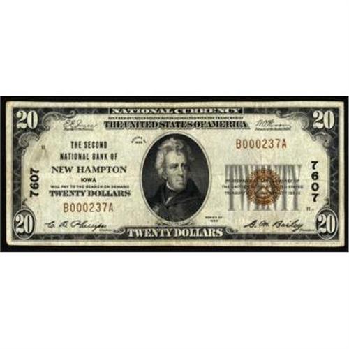 New Hampton, IA. $20 1929 Ty. 1. The Second NB. Charter #7607. Very Fine.