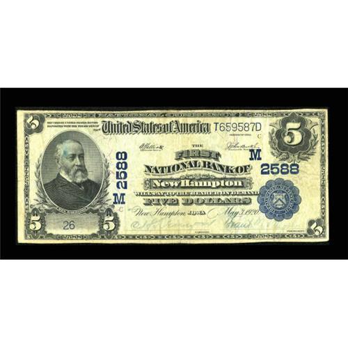 <B>New Hampton, IA</B></I> - $5 1902 Plain Back Fr. 607 <B>The First NB</B></I> Ch. # (M)2588<BR> This piece has all the eye appeal of a full VF, including remaining signatures and sufficiently bright paper. The overprint is as deep a blue as one will find. <B>Fine.</B></I><BR><BR><b>Shipping:</b> Coins & Currency (<a target="_blank" href="http://www.heritageauctions.com/common/shipping.php">view shipping information</a>)