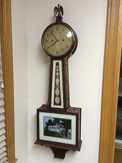 New Haven Clock Co. Vintage Banjo clock, nice painting on glass of Mt. Vernon, all original, pendulum, key, eagle finial. Measures approx. 42" tall.