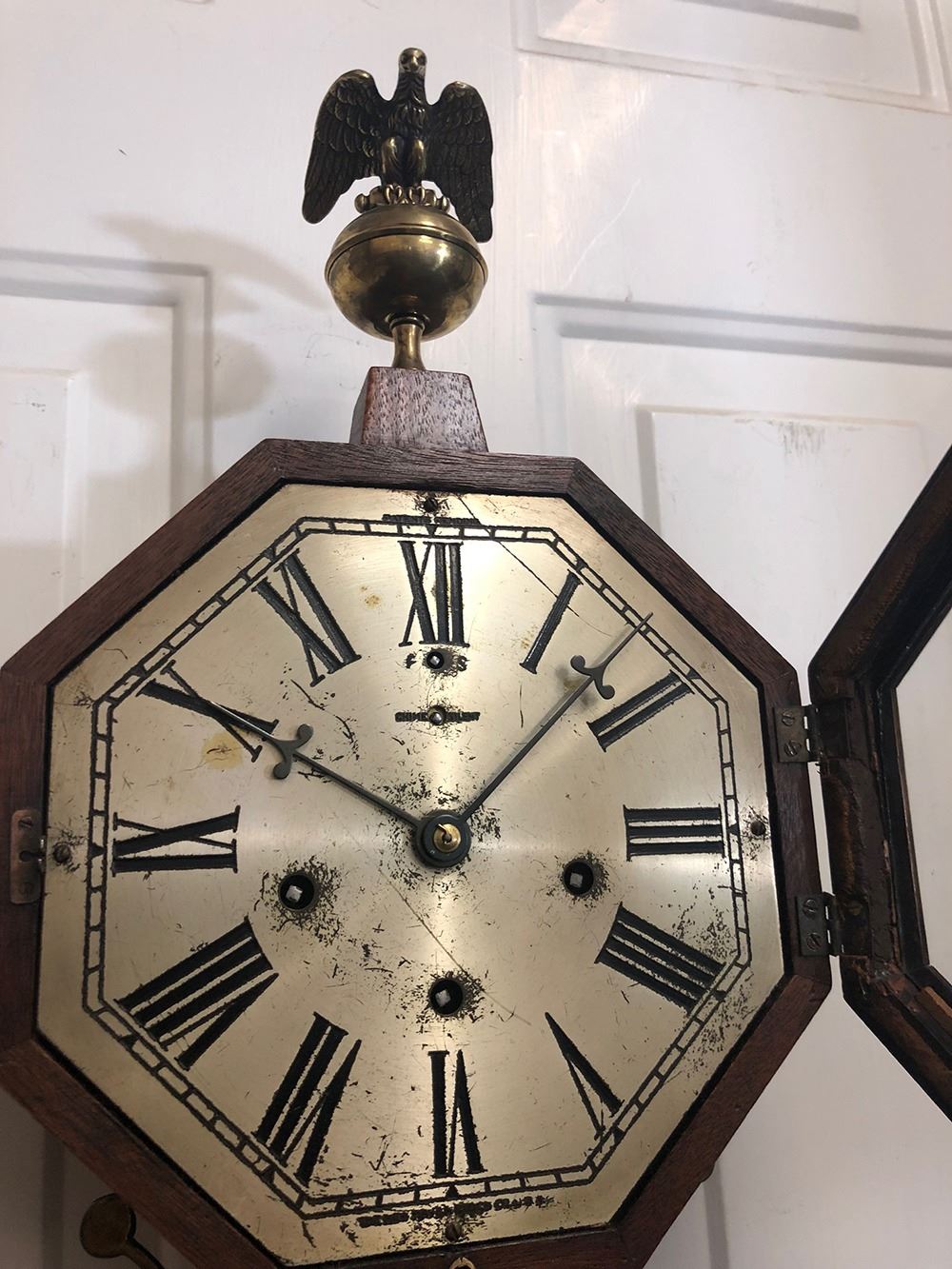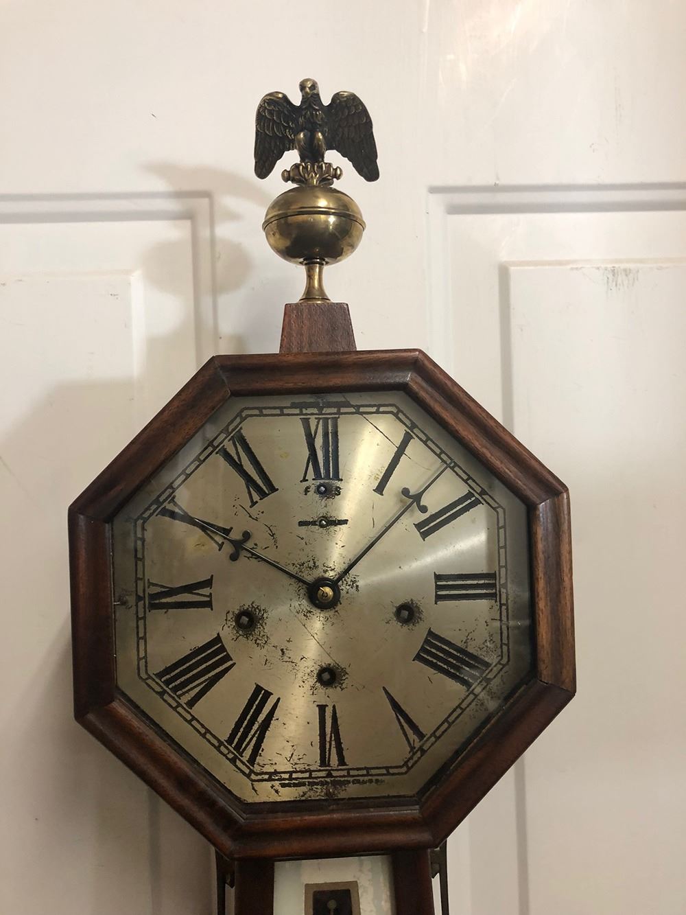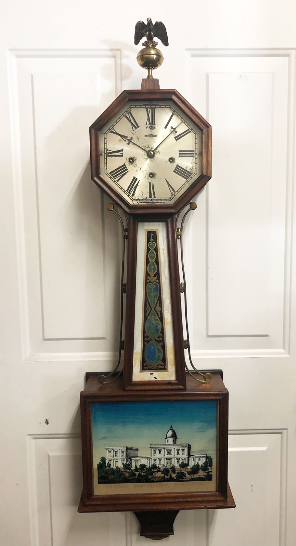 New Haven Banjo Clock, 3 wind westminister chimes, beautiful eagle fine, “The Washington Chime” made by the New Haven Clock Co. Octagon shaped face, silver dial, nice reverse painted tablet with has National observatory, Washington.