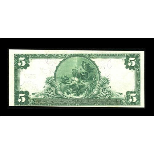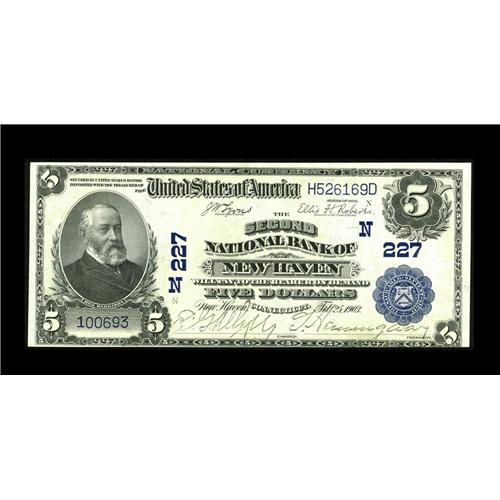 <B>New Haven, CT</B></I> - $5 1902 Plain Back Fr. 598 <B>The Second NB</B></I> Ch. # (N)227<BR>A dark blue overprint and light handling define this $5 from a successful bank managed by E.G. Allyn and S. Hemingway. <B>Extemely Fine-About Uncirculated.</B></I>