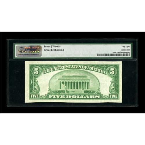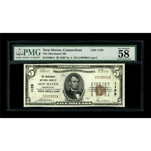 <B>New Haven, CT</B></I> - $5 1929 Ty. 1 <B>The Merchants NB</B></I> Ch. # 1128<BR> An attractive and well embossed example bearing serial number C000001A. It's housed in an early PMG holder bearing the notation "Great Embossing" and displaying a grade of <B>Choice About Uncirculated 58. </B></I>PMG has a policy of reholdering examples bearing this early designation in an EPQ holder upon request. <BR><BR><b>Shipping:</b> Coins & Currency (<a target="_blank" href="http://www.heritageauctions.com/common/shipping.php">view shipping information</a>)