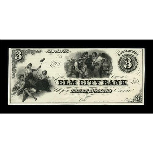 <B>New Haven, CT- Elm City Bank</B></I> $3 Haxby UNL Proof<BR>An attractive Proof mounted on heavy paper stock. It is similar in design to Haxby G6 (which is SENC), although a few details differ. <B>Uncirculated.</B></I><BR><BR><b>Shipping:</b> Coin/Currency (<a target="_blank" href="http://www.heritageauctions.com/common/shipping.php">view shipping information</a>)