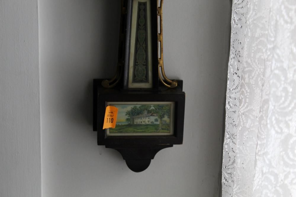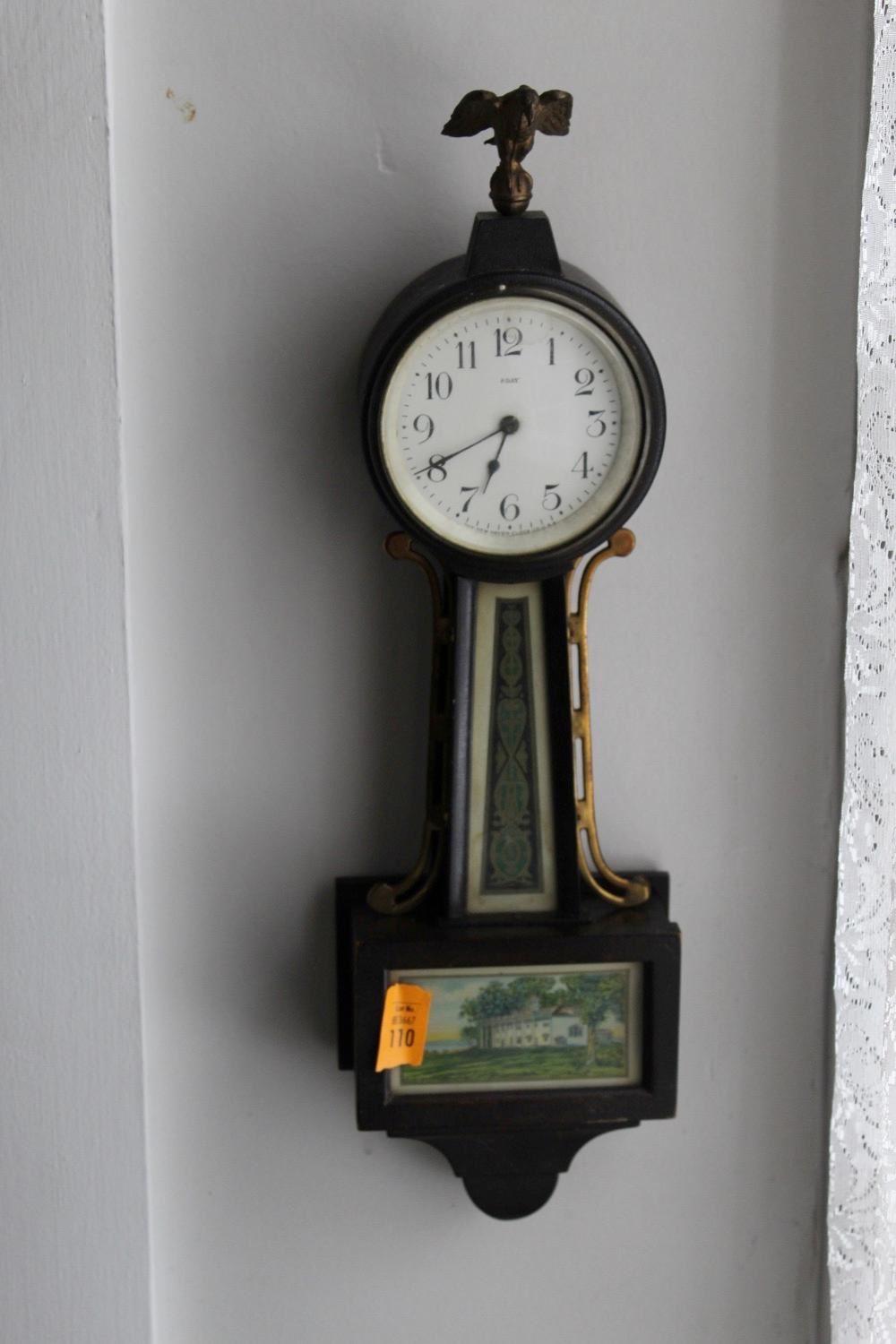New Haven Clock Co. miniature banjo clock with pastoral scene, measures approx. 18 inches tall x 5 inches wide