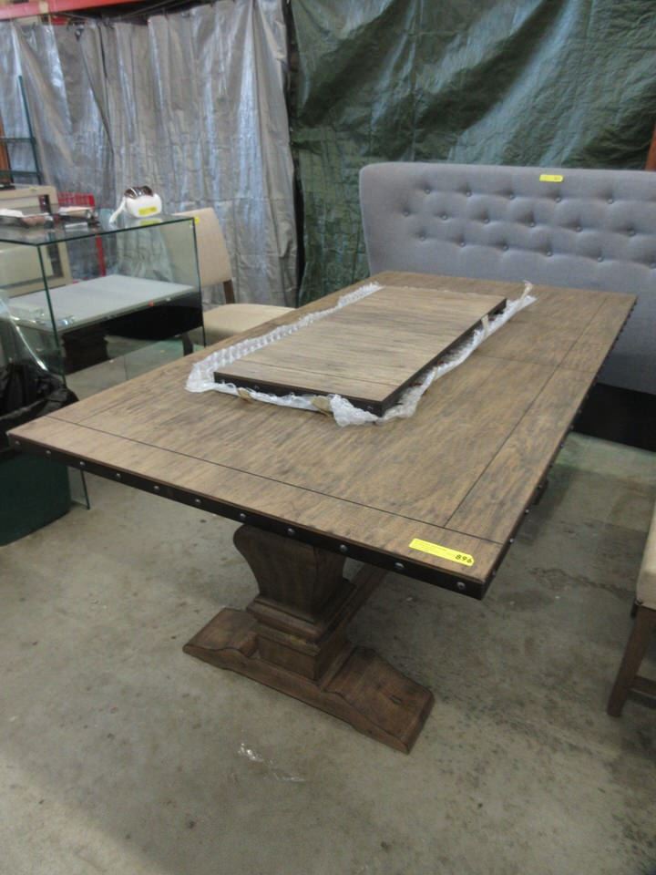 Trestle base. Nail head detail around edge. Without leaf, the surface is 42" x 78"