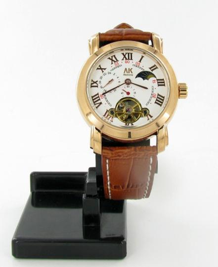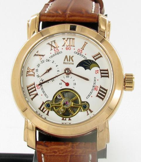Brand New men's stylish sport CHRONOGRAPH style watch in excellent new condition with moon phase, 24 hour and second dials; stainless gold tone case and leather band; box and papers; retail $1495