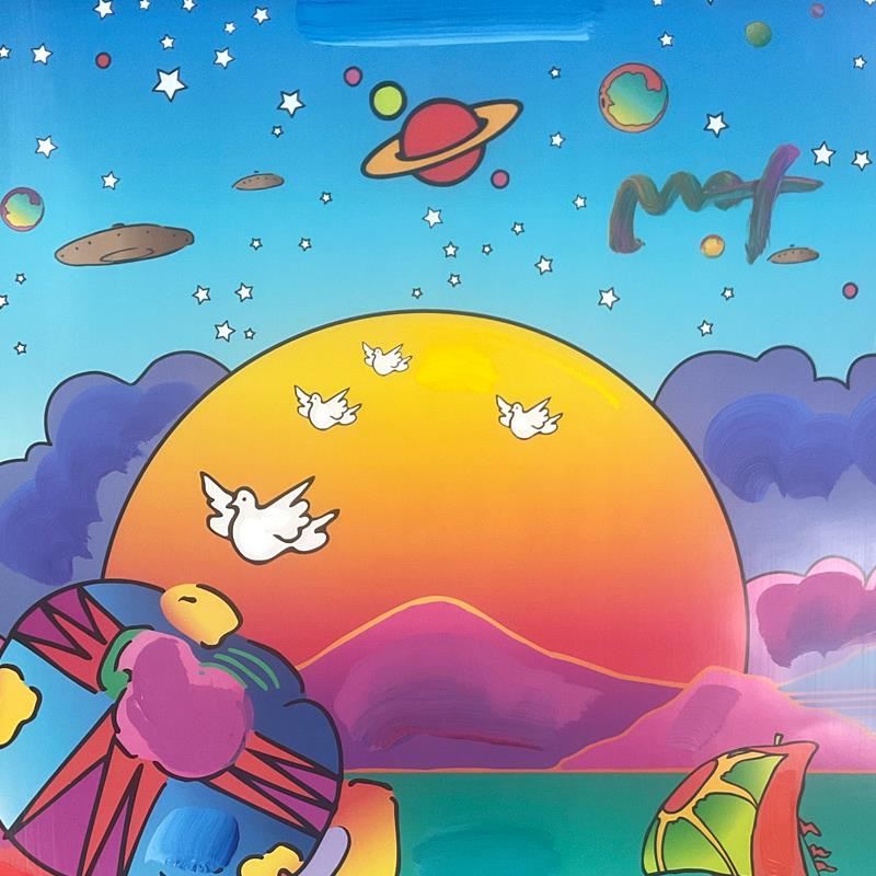 New Horizon is a one-of-a-kind acrylic mixed media on paper, hand signed by Peter Max. The piece comes custom framed with a backside cutout to display Peter Max Studio registration number 250628 certifying authenticity. Measures approx. 48.5 x 36.5 (frame), 36 x 24 (image).