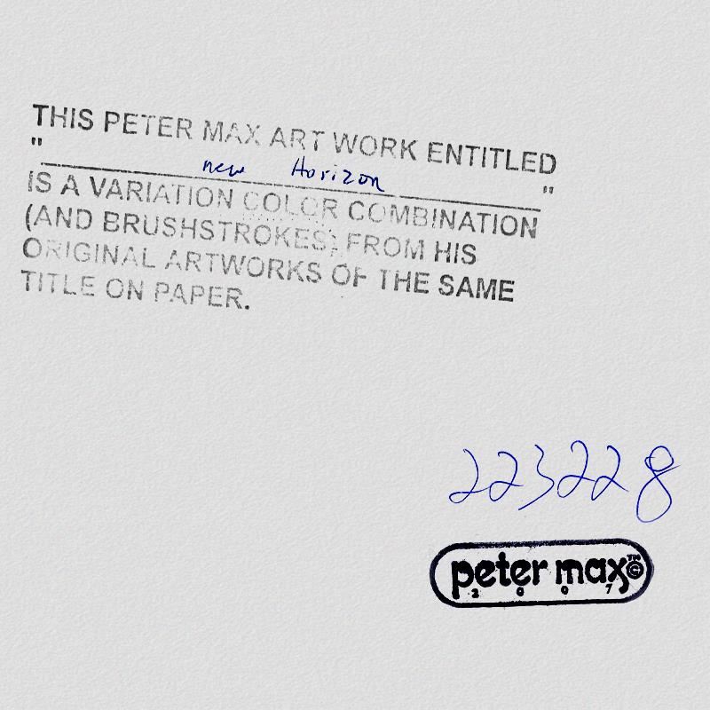 "New Horizon" is a one-of-a-kind mixed media on paper, hand signed by Peter Max. The piece comes custom framed with a backside cutout to display Peter Max Studio registration number 223228 certifying authenticity. Measures approximately 42" x 30" (frame), 36" x 24" (image).