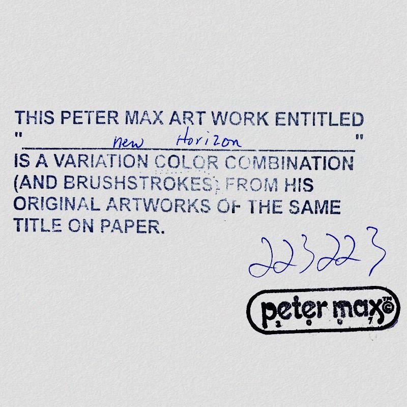 "New Horizon" is a one-of-a-kind mixed media on paper, hand signed by Peter Max. The piece comes custom framed with a backside cutout to display Peter Max Studio registration number 223223 certifying authenticity. Measures approximately 48" x 36" (frame), 36" x 24" (image). This item requires special handling and may have a longer than usual turnaround.