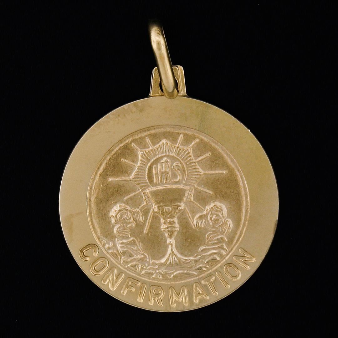 A new solid 14k yellow gold italian confirmation medallion charm pendant. The pendant weighs a total of 2.8 grams, measures 26.30x18.50mm including the bail, and the inside of the bail measures 5.85x3.40mm.