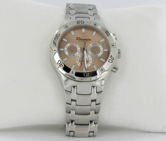 Brand New men's stylish sport CHRONOGRAPH style watch in excellent new condition with 24-hour, day , and date dials; stainless case and band; box and papers; retail $2495