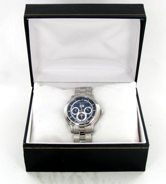 Brand New men's stylish sport CHRONOGRAPH style watch in excellent new condition with 24-hour, day , and date dials; stainless case and band; box and papers; retail $2495
