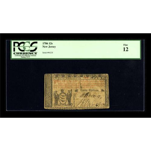 <B>New Jersey 1786 12s PCGS Fine 12.</B></I> This issue is quite elusive and this marks the first time we have handled this Colonial in one of our auctions in over six years. Strong signatures remain visible and the print is quite legible. <BR><BR><b>Shipping:</b> Coins & Currency (<a target="_blank" href="http://www.heritageauctions.com/common/shipping.php">view shipping information</a>)