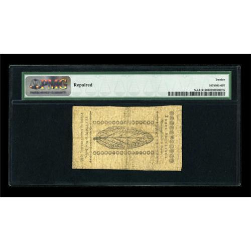 <B>New Jersey 1786 3s PMG Fine 12.</B></I> This is an extraordinarily preserved piece for this late-date note. It is extremely well signed with the red overprint being fully bright. A short internal split has been closed, which accounts for the PMG "Repaired" comment, but the note is far above the typically encountered example from this rare issue. This is the final New Jersey emission, and although it was printed in quantities comparable to the previous issues, very few examples have survived.<BR><BR><b>Shipping:</b> Coins & Currency (<a target="_blank" href="http://www.heritageauctions.com/common/shipping.php">view shipping information</a>)