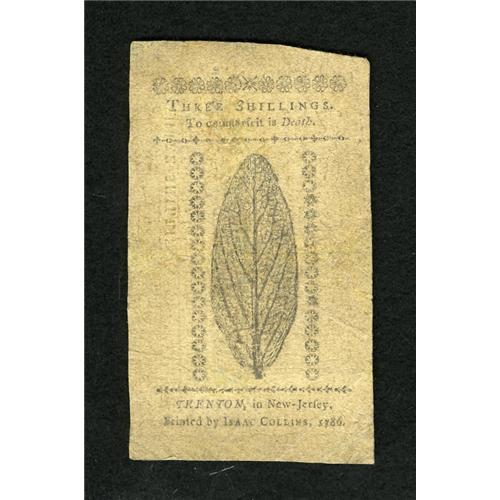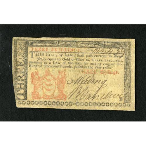 <B>New Jersey 1786 3s Very Fine.</B></I> A rare New Jersey issue, and one of the very few we've seen in any grade. This one is well margined save for the left edge of the bottom, and it's clean and free of damage. This number is not priced above Very Good in Friedberg or Fine in Newman.<BR><BR><b>Shipping:</b> Coins & Currency (<a target="_blank" href="http://www.heritageauctions.com/common/shipping.php">view shipping information</a>)